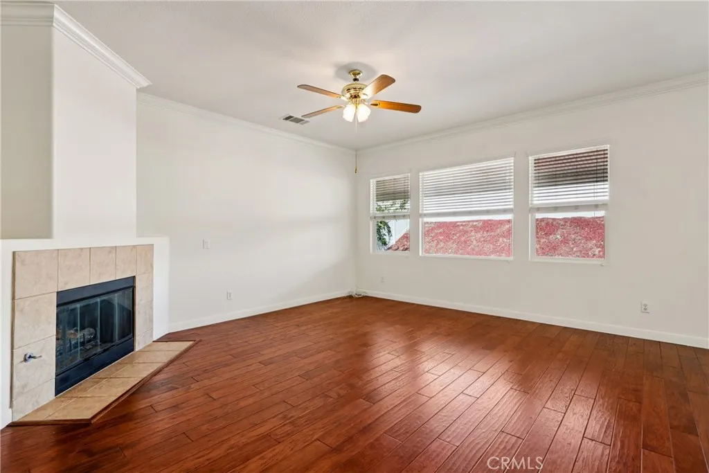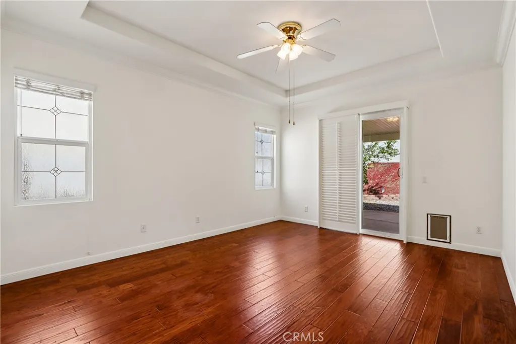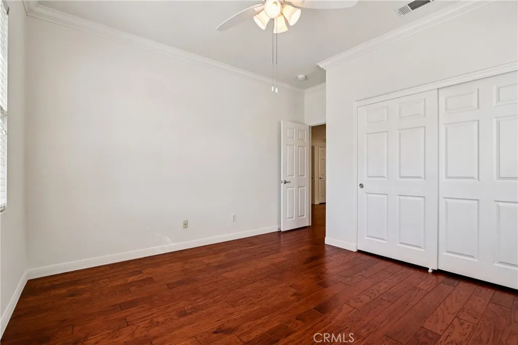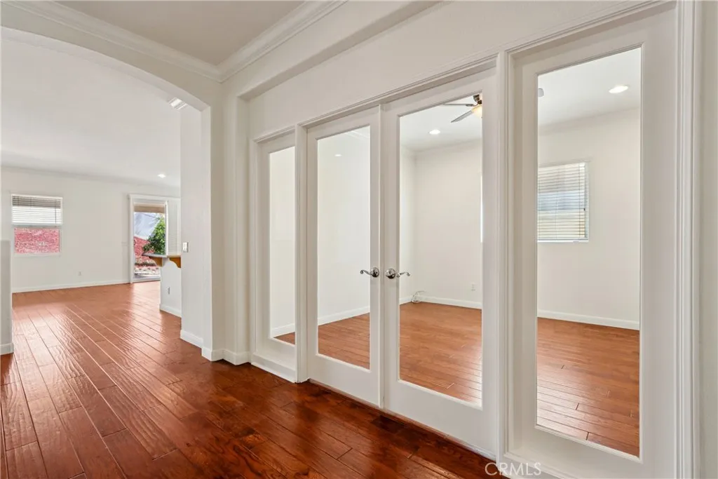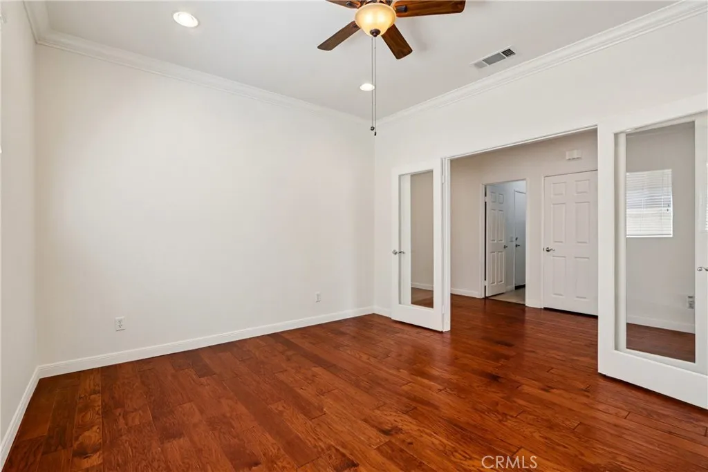 Welcome to resort-style living in the highly desirable Oasis 55+ community — where comfort, convenience, and low-maintenance living come together beautifully. This meticulously maintained home offers 2 bedrooms plus an optional 3rd bedroom with elegant French doors — perfect for a home office, den, hobby room, or guest space. With 2 full bathrooms, including a spacious primary bath with dual sinks and tub/shower combo, the layout is both functional and inviting. Step through the welcoming entry hallway into a light-filled great room with fireplace and built-in media niche, creating the perfect space to relax or entertain. The kitchen opens seamlessly to the dining area and features upgraded cabinetry, BRAND NEW stainless steel appliances, a large island, and light Corian countertops — ideal for gatherings or casual meals. Sliding doors lead to a covered patio, extending your living space outdoors. Throughout the home, you’ll find real scraped hickory hardwood floors, crown molding, plantation shutters, ceiling fans with remote controls in every room, and thoughtful custom touches that elevate the space. The spacious primary suite includes a walk-in closet and private patio access, while the secondary bedroom offers its own private bath — perfect for guests. Additional highlights include: Extra cabinetry in the laundry room; Oversized garage with custom built-in storage; Dedicated space for a golf cart; Beautifully maintained with high-end finishes. Enjoy the benefits of LOW taxes and NO Mello-Roos, plus HOA amenities that include front yard maintenance and trash service — making everyday living easy and stress-free. Located with convenient access to golf, lakes, walking trails, and community amenities, this is more than a home — it’s a lifestyle upgrade. Don’t miss this opportunity to live the good life in Oasis. This is truly not a drive-by — you must see it in person to appreciate all it offers.