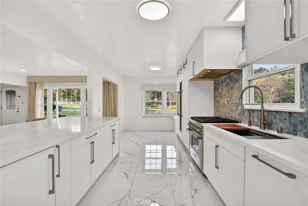 This amazing retreat is where refined design meets effortless Southern California living. Set on an expansive 13,800-square-foot flat corner lot, this beautifully maintained pool home offers a rare blend of privacy, space, and opportunity. From the moment you step inside, the home feels incredibly light and open as sunlight pours through large dual-pane windows, illuminating thoughtfully curated finishes and creating a warm, elevated atmosphere throughout. The recently remodeled kitchen is the heart of the home, featuring high-end Wolf appliances, sleek modern design, and a seamless connection to the dining area and spacious family room. This space opens to a large, tree-covered patio—perfect for morning coffee, quiet relaxation, or lively gatherings.