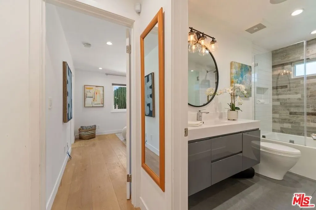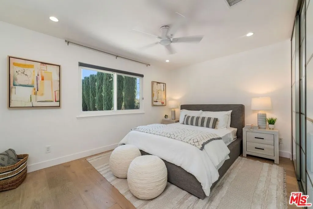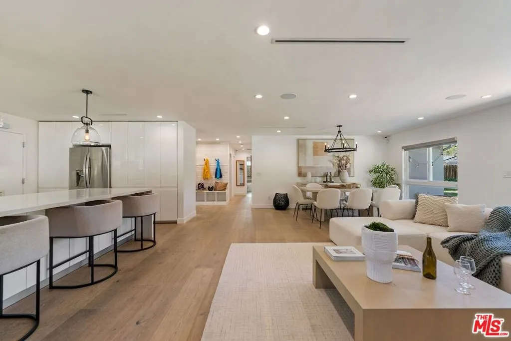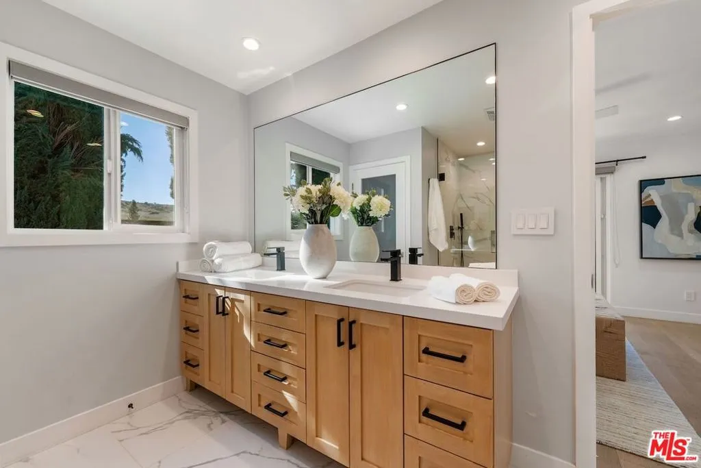 Presenting this privately gated stunning single story entertainer's oasis situated on a rare sprawling lot in Calabasas' highly acclaimed Las Virgenes School District. Set back from the street behind a secure entry gate, this beautifully remodeled residence sits on over half an acre and has been thoughtfully updated inside and out. A beautifully landscaped and illuminated drive leads to the home, creating a true estate feel from the moment you arrive. Inside, the expansive open-concept great room seamlessly connects the dining area, living room with fireplace, and a fully renovated gourmet kitchen. The kitchen is designed to impress, featuring a large center island with additional seating, top-tier appliances, quartz countertops, and extensive custom cabinetry. The well-designed floor plan includes a remodeled powder room for guests and three bedrooms. Two bedrooms are en-suite, including the luxurious primary retreat with a walk-in closet. The third bedroom is conveniently located near an additional full bath. Interior highlights include wood flooring throughout, recessed lighting, high ceilings, newer windows, central air conditioning, and a new heating system. Designed for year-round enjoyment, the great room and primary suite open directly to a spectacular backyard retreat complete with a sparkling pool and spa with a child-safety fence and a new heating system. The outdoor setting also features a fire pit lounge, expansive patio space, covered cabana, outdoor restroom, and a fully equipped cabana kitchen with BBQ, sink, refrigerator, and bar seating. Lush, mature landscaping, fruit trees, and hillside views surround the property, all enhanced by landscape lighting. Additional amenities include an upgraded alarm and security system and DoorBird entry system, a hard-wired interior and exterior sound system with central control tower, newer roof, and a high-end owned solar system with battery backup capable of powering the property independently from the grid and accommodating future expansion. Ideally located a short drive to Malibu beaches, near top-rated schools, parks, shopping at The Commons, and dining (including an anticipated opening of sushi hot spot Shibuya), this turnkey Calabasas retreat presents a rare opportunity to own a private compound in one of the area's most sought-after communities.