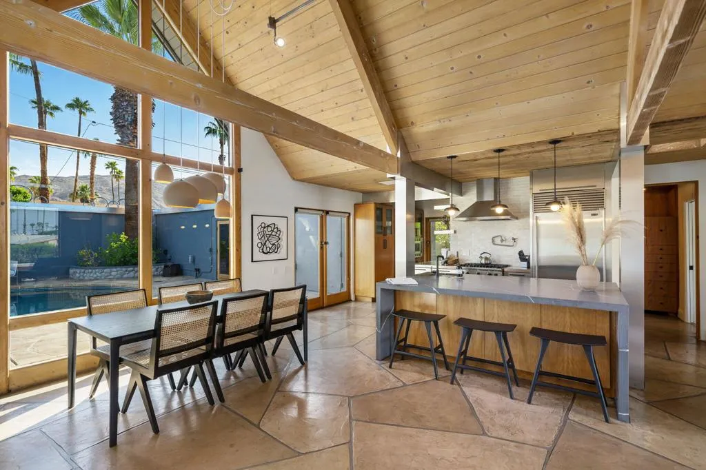 Experience one of the desert's rarest Mid-Century Modern architectural gems! This striking modern A-Frame retreat blends iconic design with cutting-edge sustainability. Featuring 2 bedrooms plus an attached casita, the home showcases dramatic wood beam ceilings, floor-to-ceiling glass, and an airy open-concept layout that frames breathtaking mountain views from both north and south exposures. The gourmet kitchen is equipped with premium appliances, making it both functional and stunning.Outdoors, the property is designed for unforgettable entertaining and total privacy. The pool and lounge area serve as the centerpiece, complemented by a private sunken gathering space behind the gated drive, complete with tiki torches and a sculptural Corten steel gas fireplace. A newly added wooden spa on the front patio creates an additional sanctuary for relaxation under the desert sky.This residence is not just visually extraordinary, it's also an advanced Net-Zero home with owned solar (43 panels), a large backup battery system, EV charger, and energy-efficient heat pumps that both heat and chill the saltwater pool. With negative electricity usage and a whole-home water filtration system it delivers luxury with sustainability and healthy living at its core.Located within walking distance to premier dining, shopping, and everyday conveniences, this furnished architectural showpiece offers a rare opportunity to own one of the area's few true A-Frame homes. An inspired blend of design, innovation, and lifestyle.