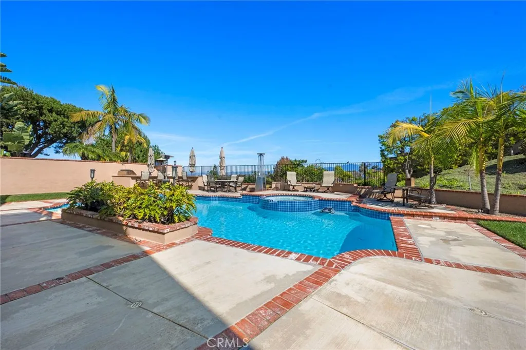 The exceptionally private backyard is built for entertaining, complete with a sparkling pool and jacuzzi, resurfaced in 2023, plus a fully equipped outdoor kitchen featuring a large grill, cooktop, sink, refrigerator, granite countertops, a huge grass area and outdoor heaters for year-round enjoyment.
