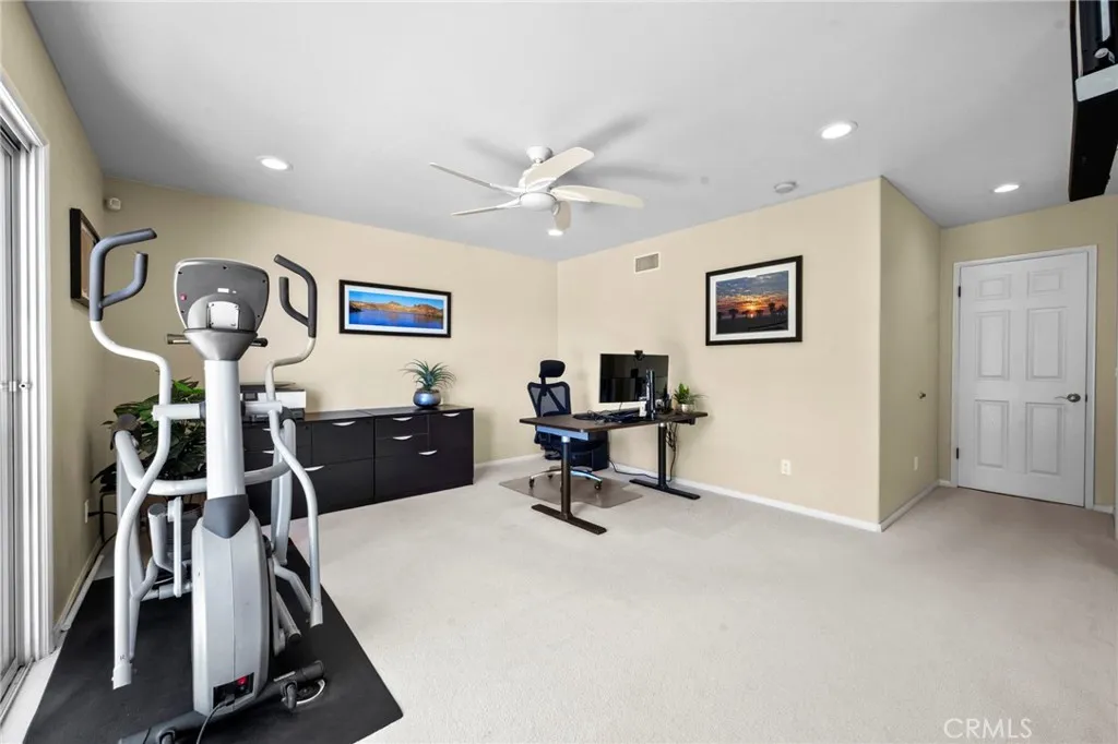 Downstairs, the second primary suite—currently used as an office—includes a walk-in closet, en-suite bath, and direct access to the private backyard oasis with pool and spa.