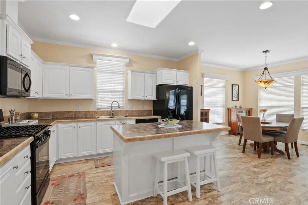The stunning kitchen is the heart of the home, complete with a large center island, generous cabinet and counter space, laminate countertops, stainless sink, gas oven and range, microwave, and a skylight that enhances the space. Luxury vinyl plank flooring adds style and durability in the kitchen, baths, and laundry area.