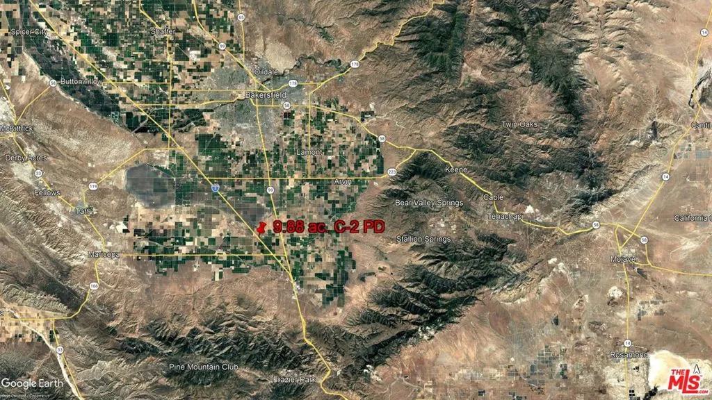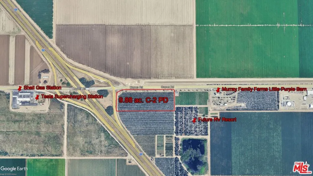 9.88 acres of commercially zoned land (C 2PD) with direct freeway access at Interstate5 and Copus Road. The property offers high visibility from the highway and is situated immediately adjacent to the Murray Family Farms Little Purple Barn, providing strong exposure to local and regional traffic. Utilities are available at the site, including power, and water which is served by an agricultural well through the Arvin Edison Water Storage District, supporting both interim agricultural use and future commercial development. The parcel is currently planted to cherry trees, with the 2026 harvest excluded from the sale. Seller would consider a lease-back or custom-farming arrangement with new owner. Located less than five miles from Hard Rock Casino Tejon, this parcel offers an exceptional opportunity for highway-oriented commercial, service, or investment uses, while also benefiting from existing agricultural production. Buyer to verify zoning, utilities, SGMA and permitted uses.