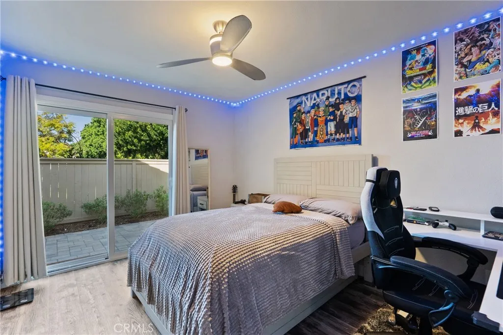 Inside, the thoughtfully designed floor plan features a spacious primary suite with an en-suite bathroom and serene backyard views. A secondary bedroom offers its own private patio with direct access to the front yard—perfect for guests, a home office, or flexible living needs. Luxury vinyl flooring runs throughout, complemented by plantation shutters, recessed lighting, and double-pane windows that fill the home with natural light. The inviting living room showcases a rebuilt fireplace, creating a warm focal point for everyday living and entertaining. The kitchen is equipped with stainless steel appliances, stone countertops, and ample storage. Built-in closet organizers and an upgraded electrical panel add both convenience and peace of mind. The home also includes an attached two-car garage and a solar system for added energy efficiency.