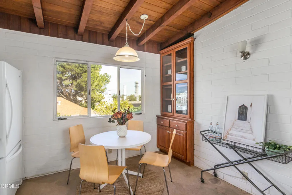 Set above the street, offering privacy and both city lights and mountain views, this post-war, mid-century home features large, spacious rooms, wood-beam ceilings, and parquet floors. Built in 1950, the home features 2 bedrooms and 1.75 baths, a spacious living room and formal dining area, a fireplace, and an eat-in kitchen, totaling 1,426 sf. There is also a large patio perfect for entertaining, a two-car detached garage, and low-maintenance landscaping.