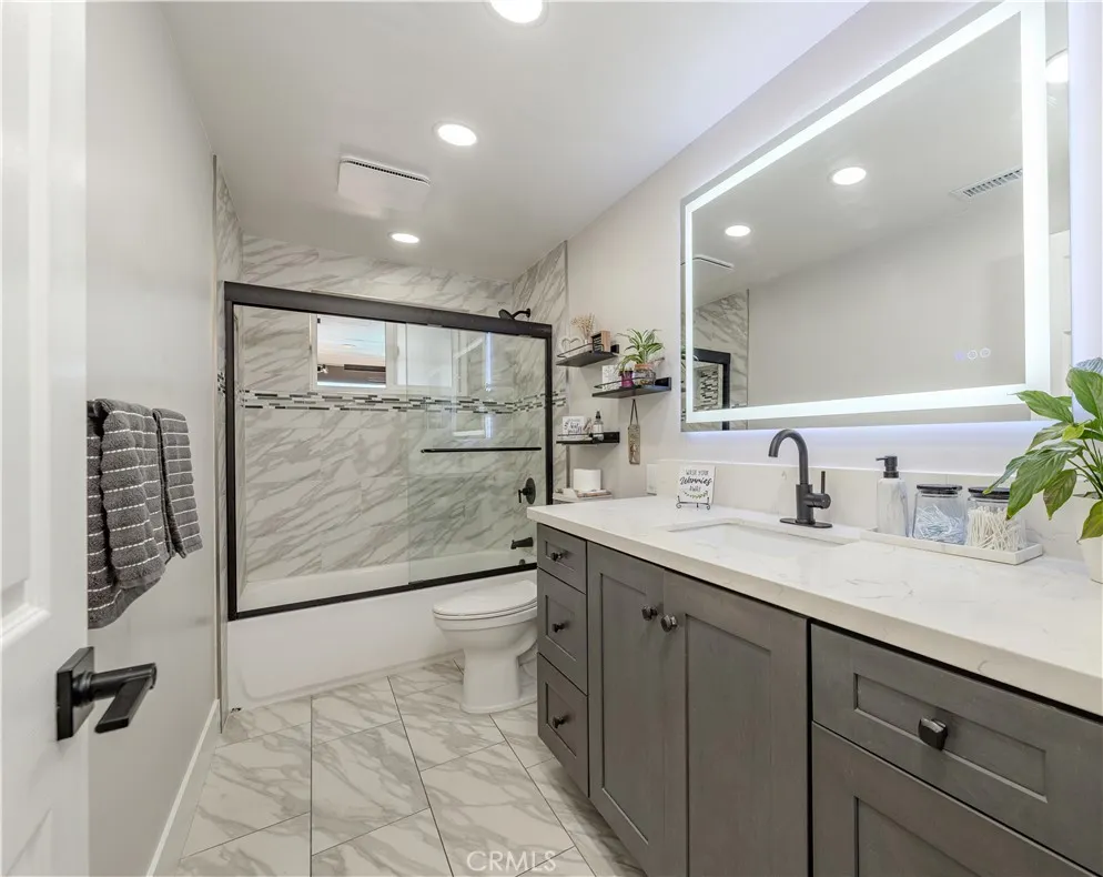 This remarkable property offers an exceptional opportunity for multi-generational living or savvy investors. Nestled in a desirable neighborhood, it features a charming single-family home, complete with an Accessory Dwelling Unit (ADU) and a Junior Accessory Dwelling Unit (JADU). As you step inside the main house, you’ll be welcomed by an expansive open-concept layout, filled with modern finishes and bathed in natural light. The kitchen is a culinary enthusiast’s delight, boasting generous counter space, ample cabinetry, and a large peninsula that serves as a breakfast bar for casual dining. The primary suite is a luxurious retreat, featuring a meticulously remodeled bathroom that includes a dual sink vanity and an indulgent walk-in shower for a spa-like experience. The main house also offers three additional bedrooms and a beautifully remodeled bathroom, providing ample space for family and guests. The JADU unit downstairs is a charming one-bedroom, one-bathroom oasis, complete with a full kitchen, a cozy living area, a convenient washer and dryer, and its own private 8x22 patio. The second ADU unit offers another inviting one-bedroom, one-bathroom space. Both units are designed with contemporary elegance, featuring striking white kitchen cabinets, quartz countertops, and luxurious vinyl plank flooring. Each unit benefits from its own private entrance and separate utility meters, ensuring privacy and independence for every occupant. The outdoor amenities are equally impressive, featuring a sprawling swimming pool and spa, alongside a covered patio ideal for memorable gatherings. There's plenty of room for all your outdoor essentials with the two storage sheds measuring 16x2 and 6x15.5. The backyard patio is conveniently plumbed and set up for an outdoor BBQ and sink island, making it the perfect spot for gatherings. An additional outdoor bathroom adds convenience for entertaining. Whether lounging by the pool or hosting lively gatherings, the backyard is undoubtedly a highlight of this exceptional property. A whole-house water softener ensures comfort, while new gutters maintain the property's pristine condition. This home is conveniently situated just minutes away from Disneyland and a wealth of popular shopping and dining venues, offering unparalleled access to some of Orange County’s most coveted amenities. Whether you reside in one unit while leasing out the others or are in search of a high-potential investment property, this rare gem is a must-see!