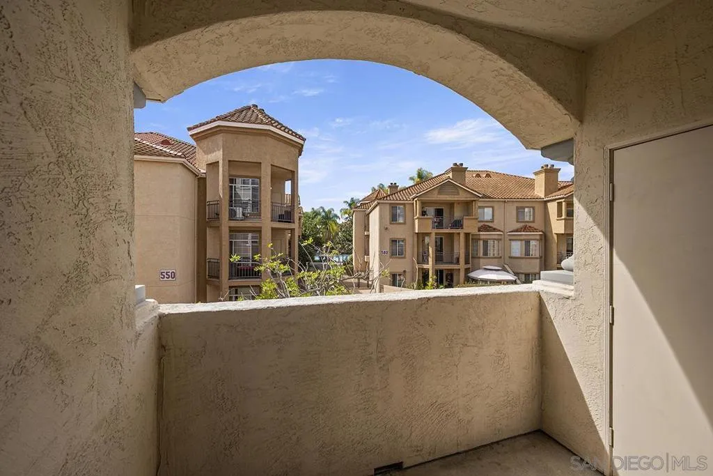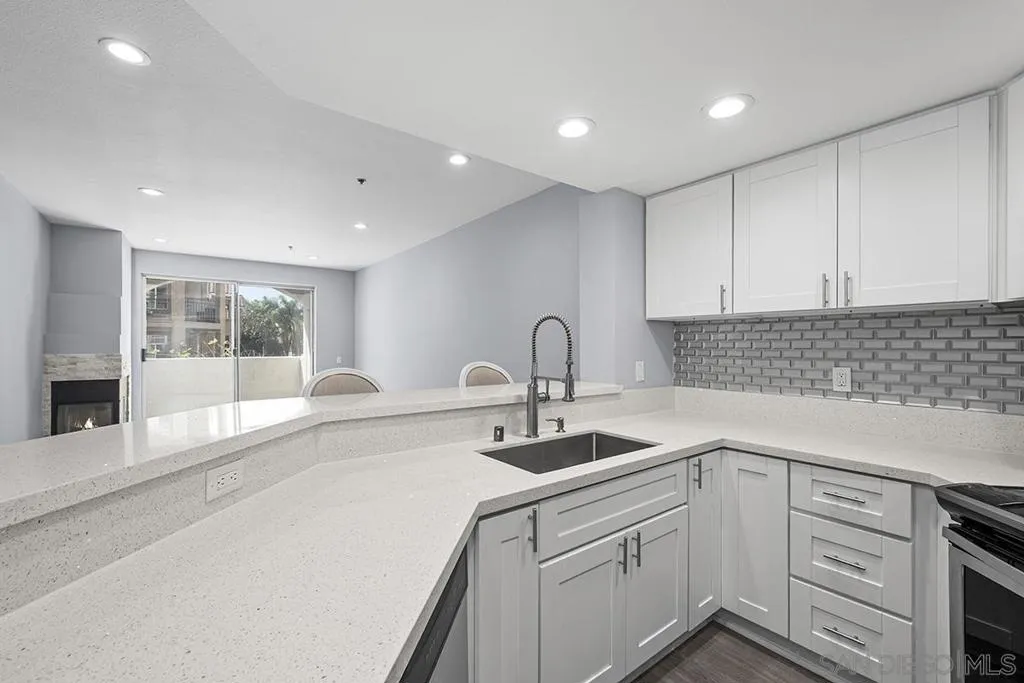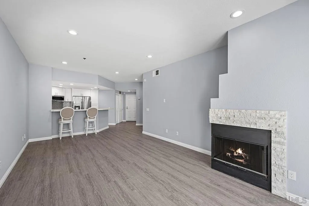 This stylishly renovated condo at Rio del Oro offers modern living in the heart of Mission Valley. Step inside to find a bright, contemporary interior featuring luxury vinyl plank flooring, crisp white cabinetry, and gleaming white quartz countertops throughout the kitchen and bath. The kitchen is equipped with stainless appliances, custom glass tile backsplash, and a convenient eat-at bar, perfect for casual dining and entertaining. The living space is warmed by a fireplace featuring a modern stacked stone façade, and abundant recessed LED lighting, creating an inviting ambiance day and night. Step out onto your private west-facing balcony with additional storage ideal for enjoying San Diego's stunning sunsets. The bedroom is a true retreat, complete with blackout shades and a spacious walk-in closet. The bathroom features a soaker tub, updated white quartz counters, and modern finishes. An in-unit washer and dryer adds everyday convenience. This home combines stylish upgrades with an unbeatable Mission Valley location with guest parking that is near shopping, dining, freeways, and transit. Don't miss this one! Rio Del Oro is a highly sought-after community nestled alongside the scenic walking and biking trails of the San Diego River and offers guest parking. Residents enjoy resort-style amenities including a pool and spa, fitness center, lush park-like common areas, and a private community room. The location is unbeatable: just steps from Fashion Valley Mall's premier shopping and dining, movie theatres, and the San Diego Trolley. Everyday conveniences are right at your doorstep with Mission Valley Center West just a short walk away, home to Trader Joe's, King's Fish House, Shake Shack, Lazy Dog, and much more. This is Mission Valley living at its finest.