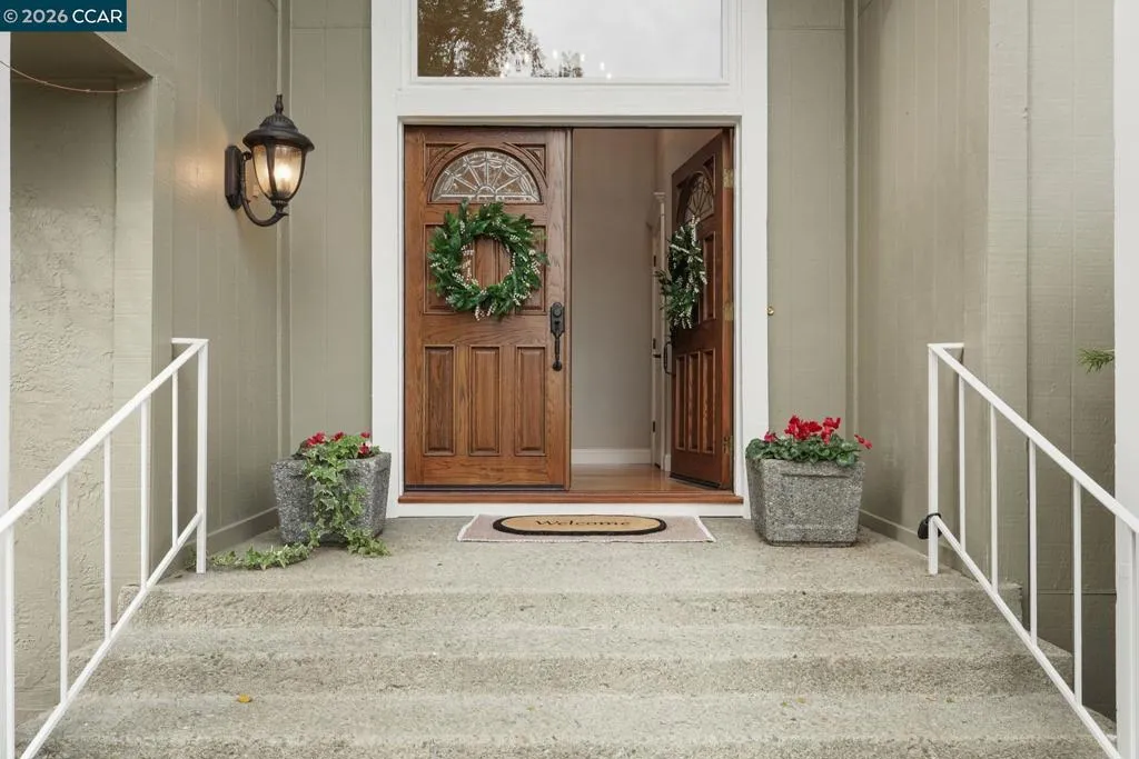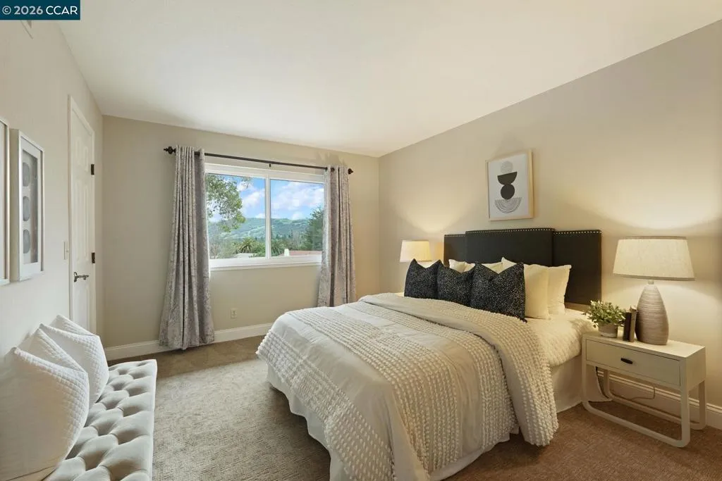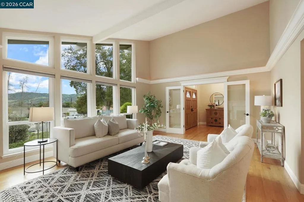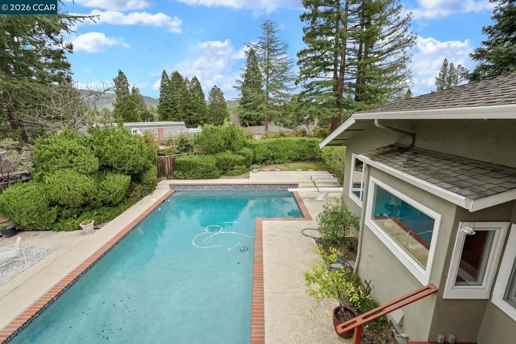 Beautiful two-story home located on a private cul-de-sac in the highly desirable Leander neighborhood of Danville. A warm welcoming entry with soaring ceilings, expansive windows, and updated lighting introduces spacious living areas with hardwood floors and a seamless, functional layout. The kitchen overlooks the landscaped backyard, pool, and Mt. Diablo views, creating an inviting setting for both everyday living and entertaining. Upstairs features four generously sized bedrooms, including a spacious primary en-suite with ample closet space and views of the Las Trampas foothills. Three secondary bedrooms include walk-in closets, and one offers a private balcony with Mt. Diablo views. The additional bedroom or office includes a beautiful built-in bookshelf, adding character and functionality. The backyard presents a private retreat with a recently resurfaced pool, owned solar for pool use, and expansive grounds offering potential for an additional dwelling. Ideally situated near top-rated schools, freeway access, and vibrant downtown shopping and dining, this well-maintained home reflects 31 years of pride of ownership.