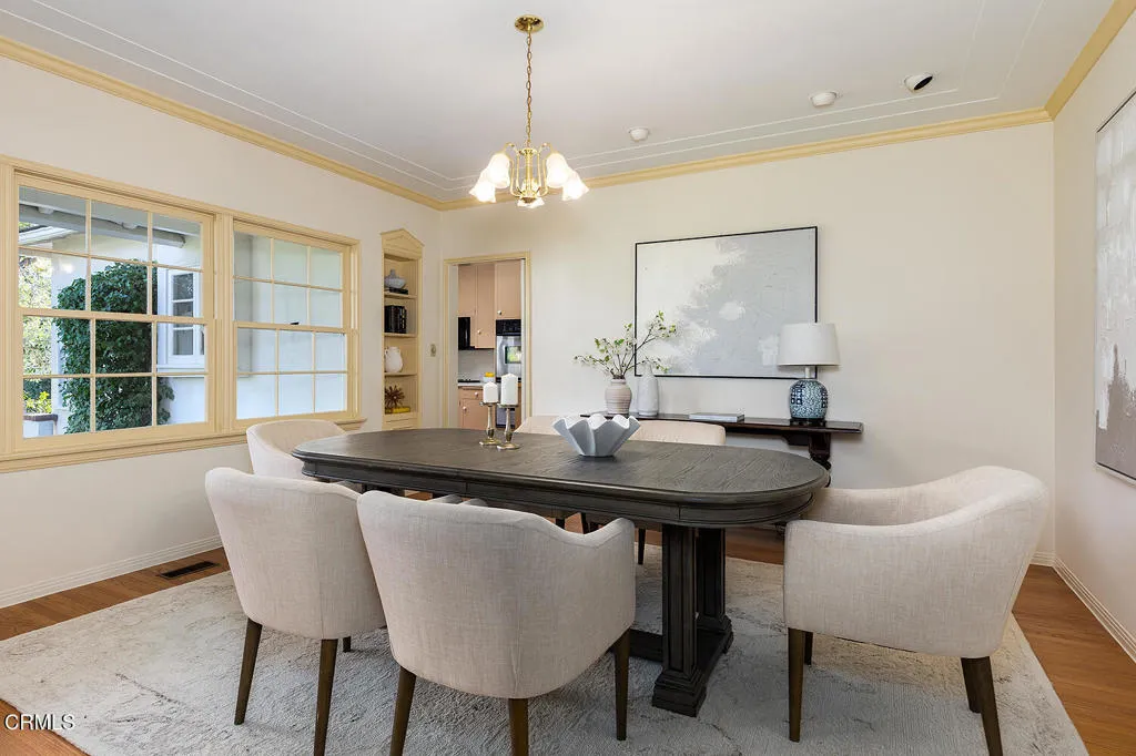 Set along one of San Marino's most desirable tree-lined streets, this classic residence offers timeless architecture, gracious proportions, and exceptional flexibility in a premier neighborhood location.The main home features four bedrooms and two bathrooms, thoughtfully arranged within a layout that balances comfort and scale. A welcoming facade and mature landscaping introduce interiors defined by warmth and character. The light-filled living room, anchored by a fireplace and custom built-ins, flows effortlessly into a formal dining room detailed with crown molding, an ideal setting for both refined entertaining and everyday gatherings. An enclosed sun porch extends the living space and opens to the rear gardens, creating a seamless connection between indoors and out.The spacious primary suite offers dual walk-in closets, while the additional bedrooms provide versatility for family living, guests, or dedicated work-from-home space. Hardwood floors, custom built-ins, and well-proportioned rooms reflect enduring craftsmanship and thoughtful design.Beyond the brick patio and citrus trees, a detached studio with its own bath, kitchenette, fireplace, and generous storage enhances the property's appeal. Whether used as guest quarters, a creative retreat, or a private executive office, this separate structure adds meaningful flexibility rarely found in this setting.The landscaped grounds provide privacy and tranquility, with multiple areas for outdoor dining and entertaining. A detached two-car garage with additional storage and a smart irrigation system serving both front and rear gardens add convenience and functionality.Moments from Lacy Park, the Huntington Library, and San Marino's award-winning schools, this is a rare opportunity to own a residence that balances architectural character, flexible living, and an exceptional location.