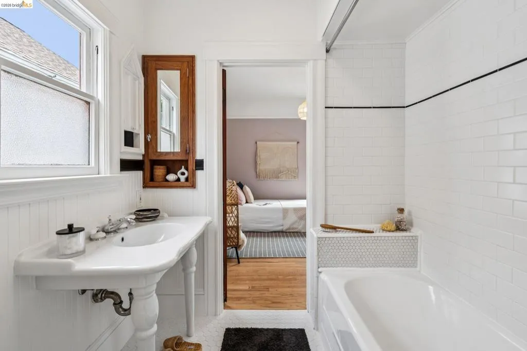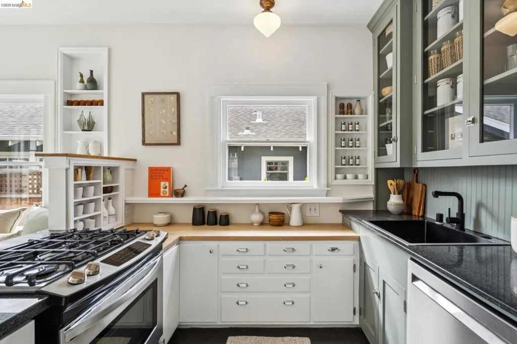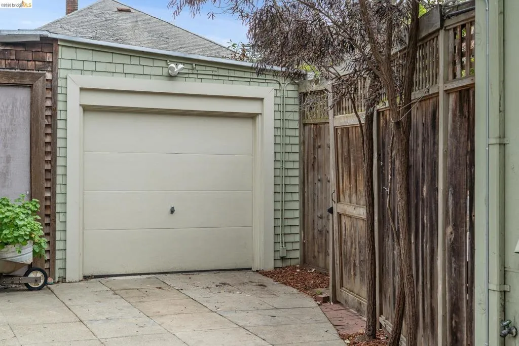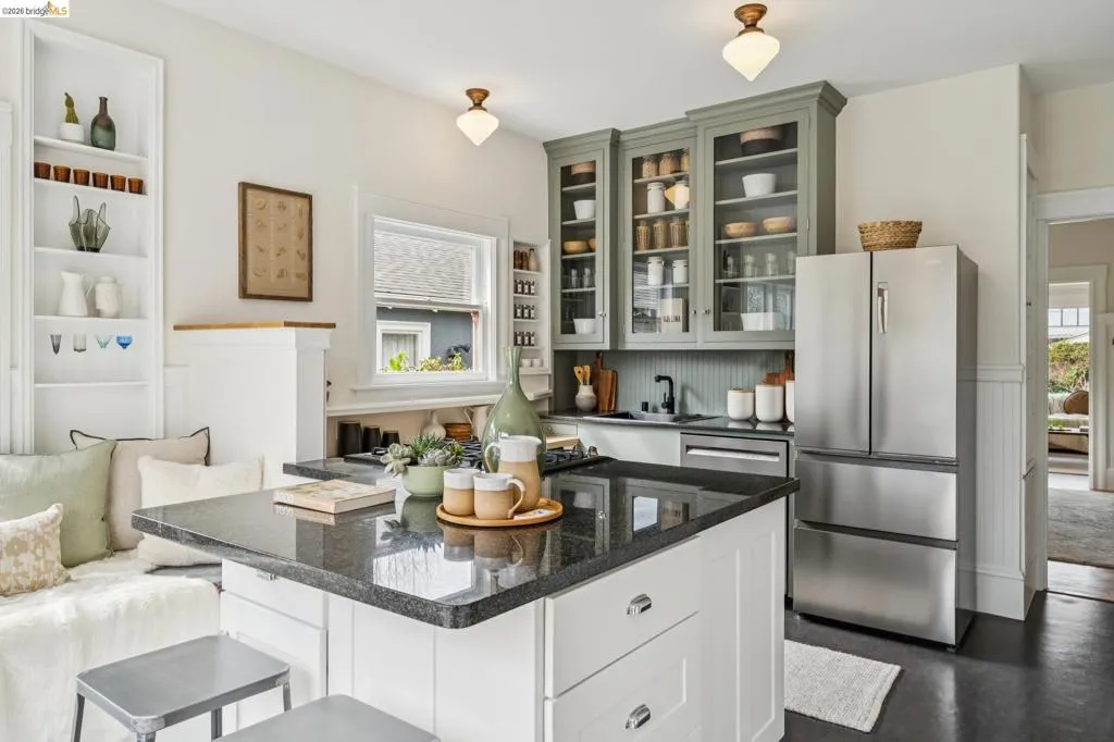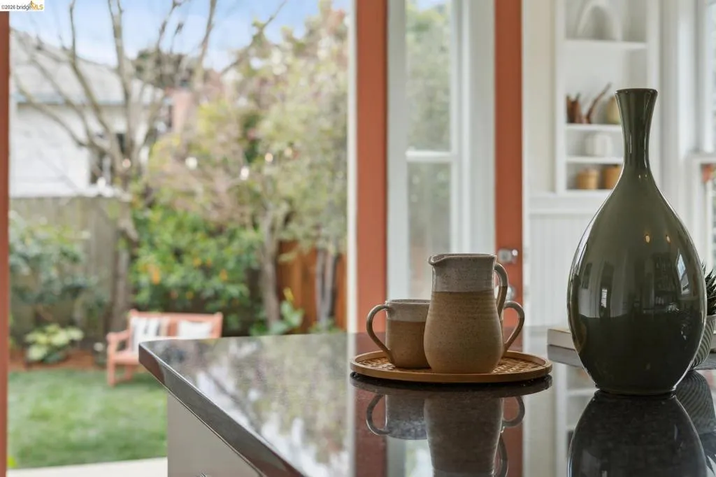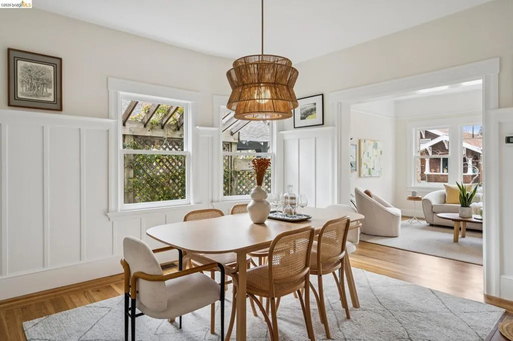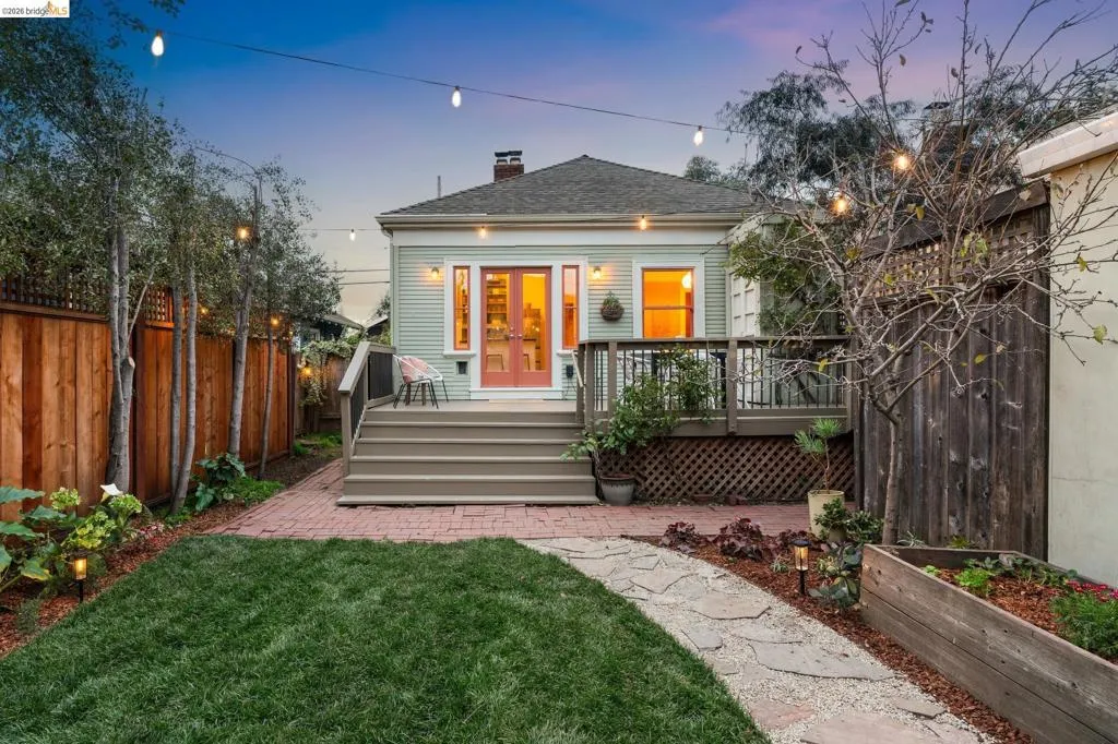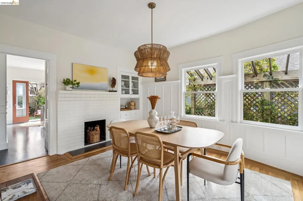 Welcome to this cheerful Craftsman bungalow with vintage details and an A+ location! A colorful and fragrant front garden and a quaint front porch are your first impressions. Enter into a large living room with a picture window, and pass into the dining room with a designer chandelier, brick fireplace, and built-in cabinetry. Front and rear bedrooms share a crisp white tiled bathroom with a shower-over-tub and a vintage porcelain pedestal sink. The large kitchen offers many features such as a new refrigerator (02/2026), two-tone cabinetry, black quartz countertops, handsome dark linoleum flooring, plus a large built-in bench! This space is bright with western/southern exposure and a view of the garden. There is a large deck off the kitchen, flowing out to a lush lawn with border plantings. The detached structure is an office/bonus space with the second full bath.* Located within 2 blocks of Market Hall, BART, 2 blocks from Frog Park, and 3 blocks from the Temescal Farmers Market, the convenient lifestyle here enjoys all that is wonderful about Rockridge! Walkscore® = 92. *Buyer to investigate.