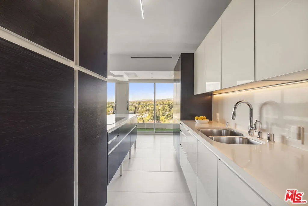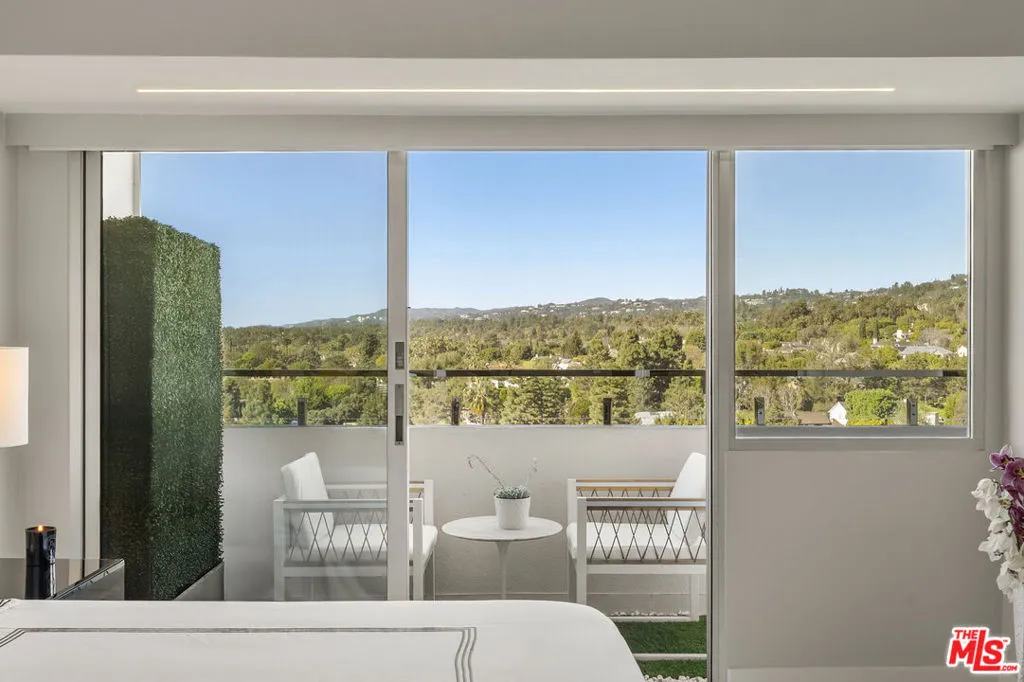 Positioned on the 12th floor of iconic 838 Doheny, this two-bedroom, two-bath residence offers one of the building's most sought-after floor plans with unobstructed west-facing views over Beverly Hills. Wrapped in glass, the residence was reimagined with custom finishes throughout, including a German Alno kitchen, Calacatta Borghini de Oro marble baths, bespoke Kneedler Fauchere wallcoverings, tall custom doors with curated hardware, Lutron linear lighting, smoked glass architectural elements, new appliances, and an integrated smart home system. Fleetwood sliding glass doors open to an extended terrace with panoramic city and mountain vistas framed by endless Sunsets. The residence may be sold fully furnished. The building has completed a $14M structure modernization and offers 24-hour concierge and valet, on-site management, two pools, and a newly renovated rooftop fitness center.