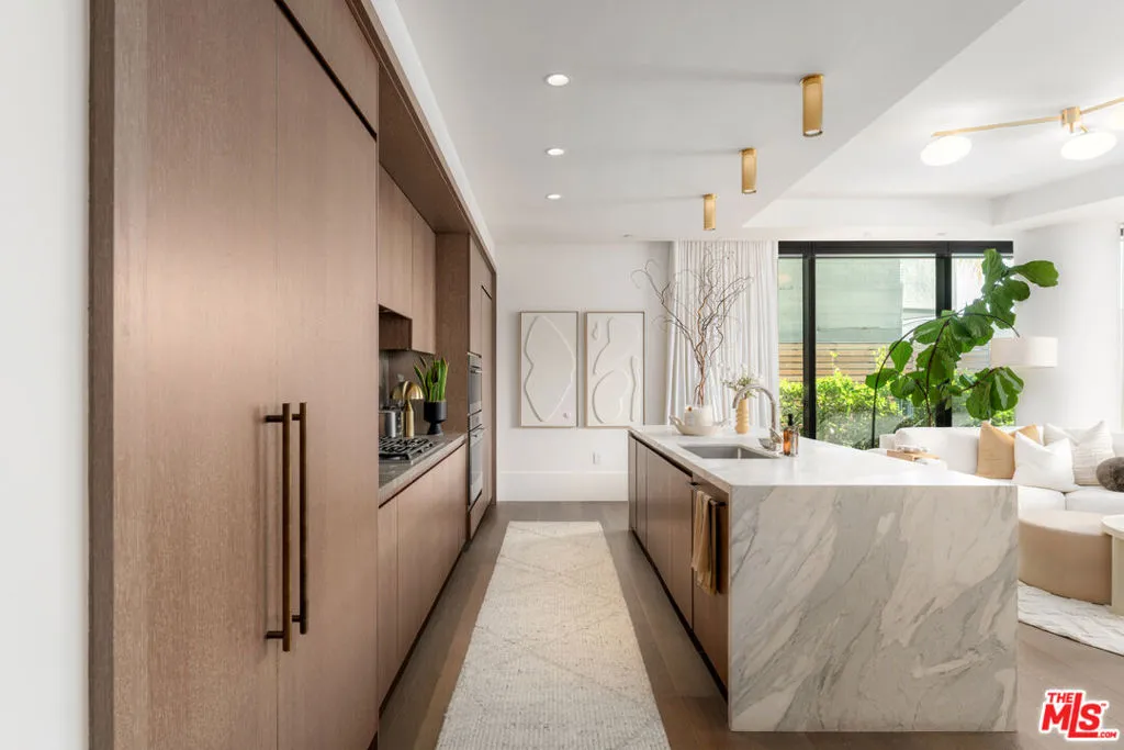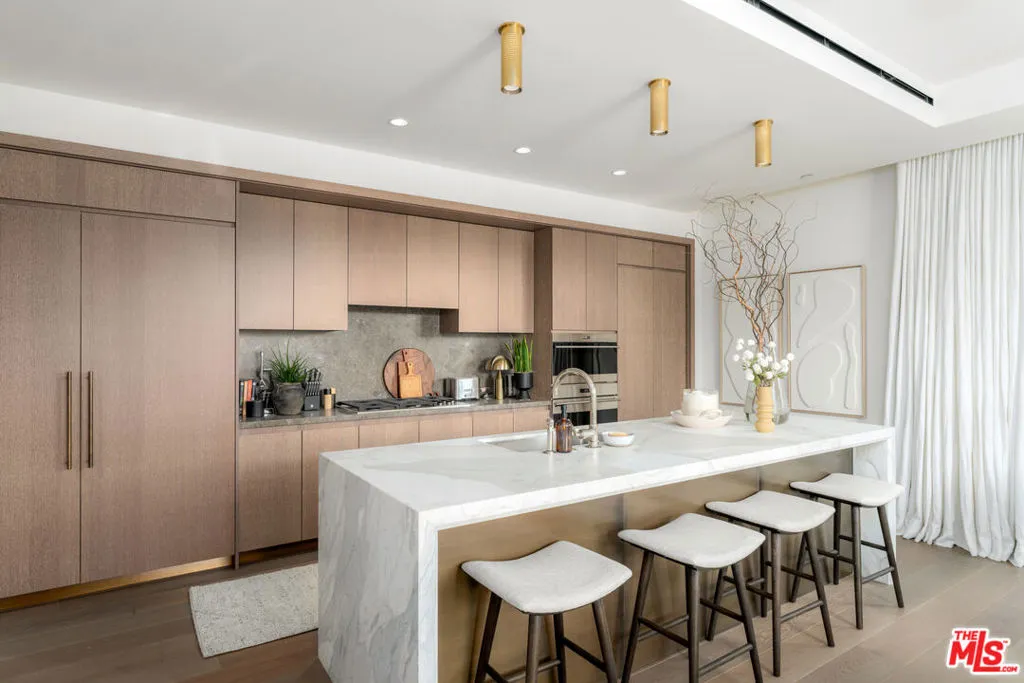 Residence 107 at The Sun Rose presents a rare opportunity along the iconic Sunset Strip, blending contemporary design with the effortless luxury of a premier full-service address. Floor-to-ceiling glass fills the interiors with natural light, highlighting wide-plank white oak floors and a seamless open layout tailored for both sophisticated entertaining and relaxed everyday living. The bespoke kitchen is outfitted with Sub-Zero and Wolf appliances, custom stained oak cabinetry, Waterworks fixtures, and a striking Calacatta Borghini marble island, while the primary suite offers a private retreat complete with a tailored Poliform dressing room and spa-inspired marble bath. A secondary en-suite bedroom, refined powder room, dedicated laundry, integrated audio, private elevator access, and two side-by-side parking spaces with EV charging enhance the residence, complemented by 24-hour concierge and security, valet, rooftop pool, fitness center, garden terrace, resident lounge, and exclusive access to The Sun Rose's signature hospitality amenities.