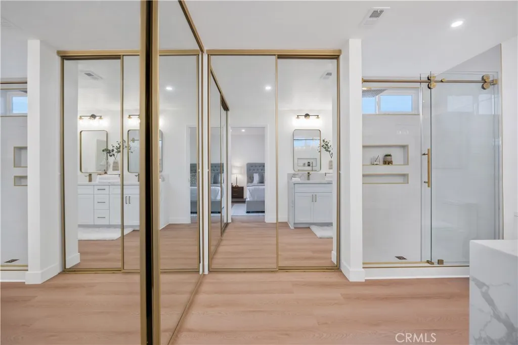 The primary suite offers a spa like retreat with a walk in shower featuring oversized shampoo niches, double vanities with quartz counters, soft close cabinetry, and upgraded fixtures. All bathrooms have been fully remodeled with modern cabinets, countertops, faucets, mirrors, and low flow toilets. Each bedroom has new flooring, baseboards, paint, and lighting for a fresh, modern feel. Additional smart home features include a Nest thermostat, Ring camera doorbell, and a full PEX repipe for added peace of mind.