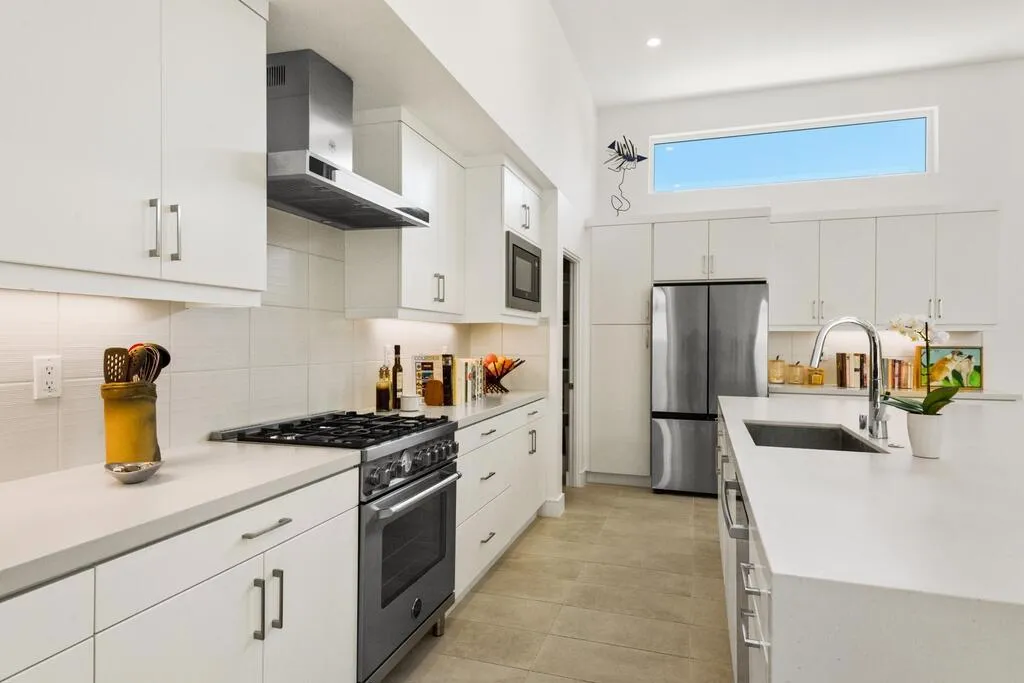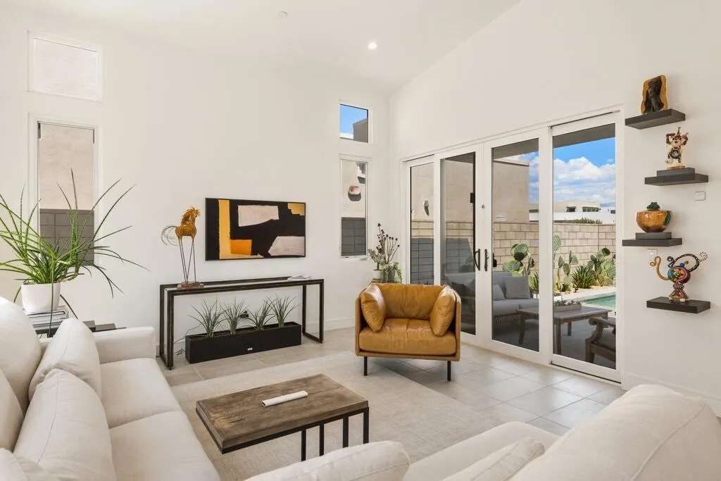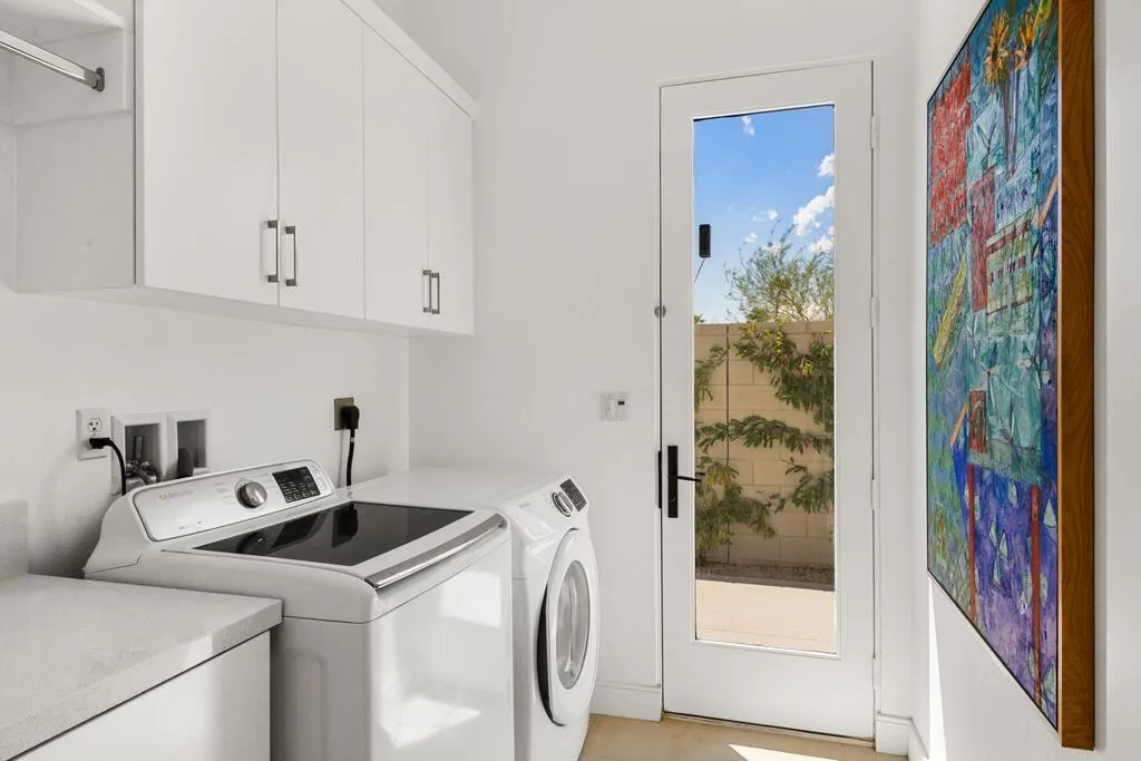 Reduced and priced to sell ! Exclusive private gated community of Miralon in Palm Springs, just minutes from downtown! This PLC Communities built home comes with OWNED SOLAR, providing energy efficiency, savings, and long-term value. The private yard features a sparkling 8x15 cocktail pool with tanning shelf and umbrella sleeve, outdoor shower, programmable pool heater, drip irrigation, and landscape lighting--all framed by a peek at the San Jacinto Mountains. Inside, the modern open floor plan is filled with natural light. The kitchen boasts premium Bertazzoni & Bosch appliances, a Samsung refrigerator with interior beverage center, crisp white cabinetry, and a large island with bar seating. Smart home upgrades include Brilliant switches, Honeywell smart thermostat, programmable exterior lights, Ring system, and keyless entry. All bedrooms are spacious, including a primary retreat with outdoor access. With 3.5 baths, three with walk-in showers, the home blends comfort and style. Community amenities include lakes, dog parks, walking trails, plus a clubhouse with pools, spa, gym, yoga/Pilates, bar, demo kitchen, herb gardens, olive tree groves and more!
