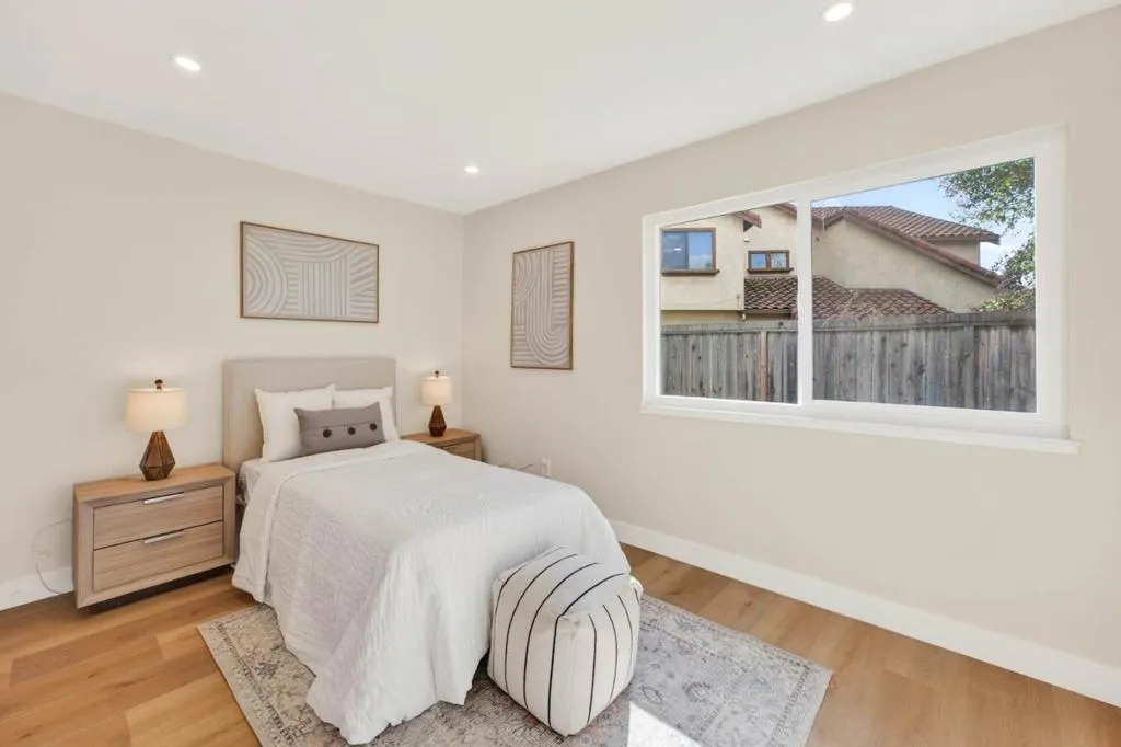 Experience modern elegance at 2056 Nottoway Ave, a stunningly renovated 1,167 sq ft single-family home in San Jose. Built in 1978, this 3-bed, 2-bath residence features a bright, open-concept interior with wide-plank flooring and recessed lighting throughout. The gourmet kitchen is a showstopper, boasting sleek white and wood-toned cabinetry, designer gold hardware, and a dramatic quartz slab backsplash. The living area, anchored by a white brick fireplace, flows into a dining space illuminated by a contemporary halo chandelier. Retreat to the primary suite, which offers direct sliding door access to a private backyard featuring lush turf, decorative stone borders, and a patio perfect for entertaining. Both bathrooms are masterfully updated: one featuring a vessel sink with gold fixtures and a walk-in shower with marble-style tiling, and the other offering a sleek black vanity and a soaking tub with integrated sliding glass doors. Additional highlights include a versatile home office and a two-car garage with modern exterior lighting. This home perfectly balances contemporary luxury with Silicon Valley convenience and is located within easy reach of local shopping and major commute routes. Welcome home!
