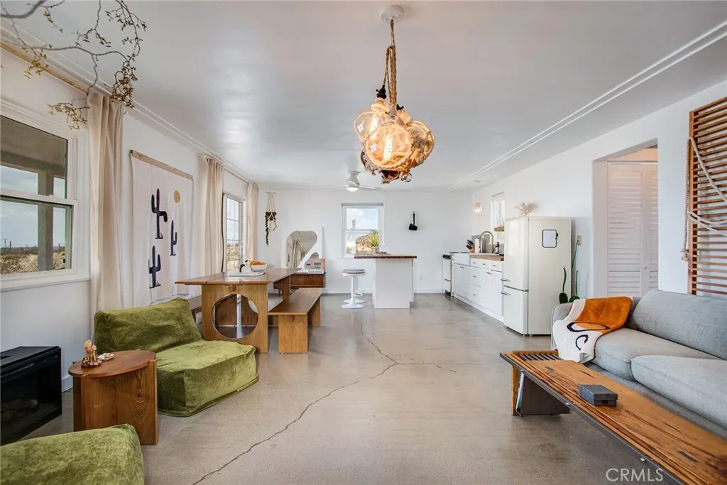 PRICE REDUCTION: Authentic Mid-Century Modern 2-Bedroom/2-Bathroom Bungalow - updated and reimagined by owner/architect, featuring new kitchen cabinets and island with butcher block counters and farmhouse sink. Polished concrete floors throughout. Floor-to-ceiling tile in walk-in shower. Zoned ductless mini-split heating/cooling for efficiency. Heated & Filtered Cowboy pool for year-round use. Shaded front porch to relax for morning or evening beverages. Rural location spread over a large 5-Acre parcel for privacy. Commanding views of iconic Goat Mountain. Short distant to world-famous Giant Rock for wilderness excursions. Local gourmet eateries, including La Copine & Giant Rock Reading room, great for socializing as well. Only a short drive to Joshua Tree National Park and Pappy & Harriet’s in Pioneertown for music. Great getaway but also perfect for remote work. Whether a vacation getaway or a primary residence, the rural ambiance is the grounding factor along with its convenient location to shopping & dining in nearby Flamingo Heights, Yucca Valley or Joshua Tree.