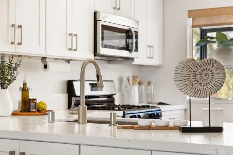 Welcome to resort style living! This remodeled and upgraded condo is perched on a hilltop looking east to Rancho Santa Fe and the mountains beyond. Located just 3.5 miles from the beach in the highly desirable Country View residential community (not age restricted) with luxurious amenities such as 2 pools with spas, an executive 9-hole golf course, pickle ball court, bocce ball court, and clubhouse that hosts regularly scheduled events. Walk-in access to Manchester Preserve hiking trails. This light and bright open floor plan features: - Vaulted ceilings and stunning panoramic views, - A fully updated functional kitchen with extra storage, quartz countertops, extra-large sink, - Meticulously crafted cabinets with soft close drawers, - Remodeled bathrooms with premium TOTO toilets & fixtures, and an extra deep soak tub, - Fresh interior paint and engineered wood flooring throughout, - Dual pane windows with upgraded window coverings, - Stackable LG washer and dryer units, - Energy-Efficient HVAC (Central Heating and Air) - A private balcony to enjoy for relaxing and entertaining, - One-car detached garage plus plenty of parking nearby. Conveniently located in Encinitas, just minutes away from grocery stores, restaurants, top rated schools, easy access to the freeway, shopping and all that the Southern California beach lifestyle affords! A must see!