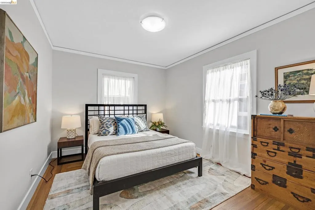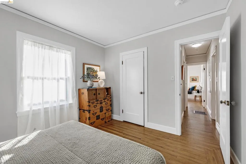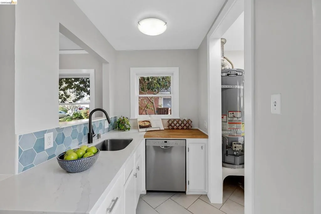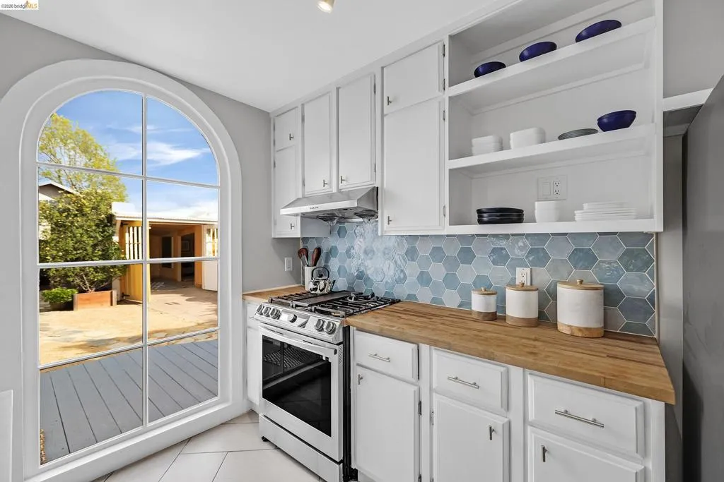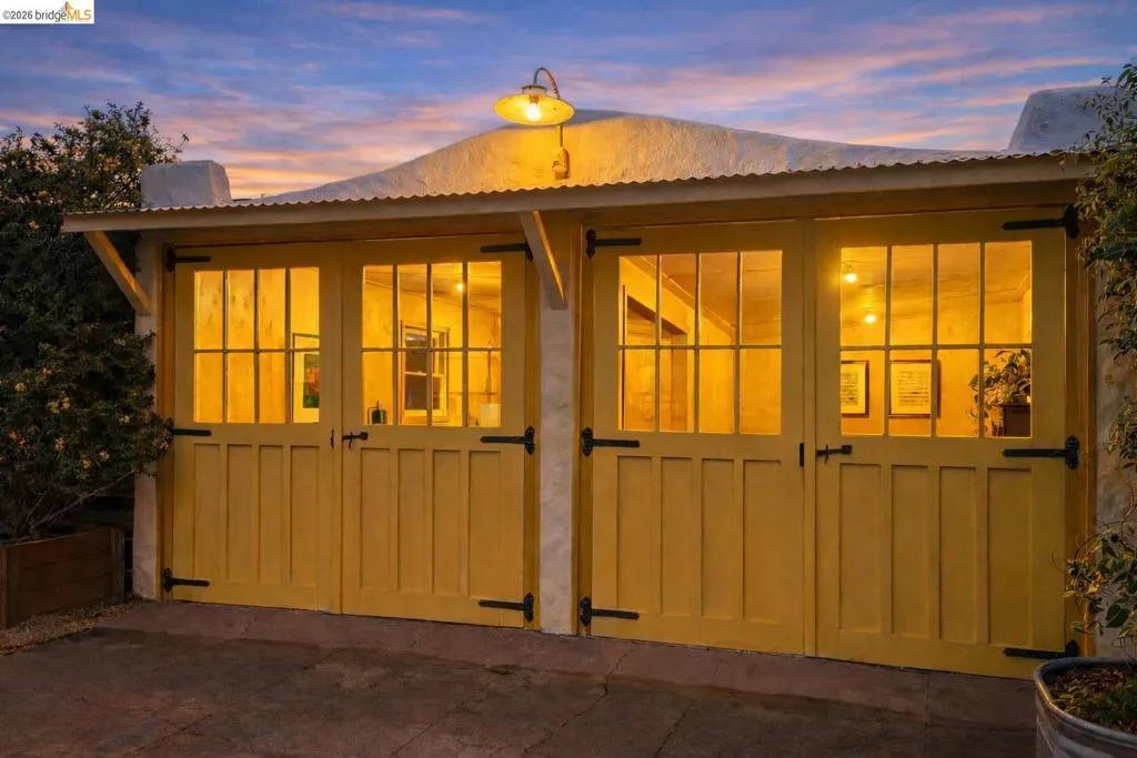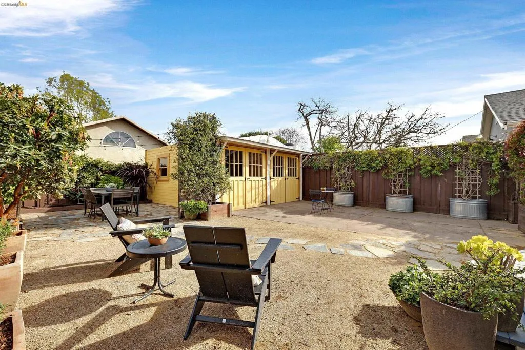 Friendly neighborhood, affordability, convenient amenities, an adorable house with parking and bonus space… it’s all here! Step through the delightful brick-red arched door into this single-level Spanish-style bungalow and find warmth and ease. From the distinct wood-mantle fireplace to the series of arches throughout the house, architectural charm abounds. The updated kitchen features butcher block and quartz counters, hexagon-tile backsplash and stainless-steel appliances. At the heart, sunlight spills through a tall window with a view of the backyard oasis. A breakfast nook offers a sweet spot to sip morning coffee. And the kitchen “annex” has a washer and dryer and easy outdoor access. Two comfortable bedrooms share a bathroom in between. The hallway has two linen closets, a 1920s telephone portico, and pull-down ladder access to attic storage. The backyard is your private haven with beautiful low-maintenance landscaping, spacious enough for entertaining or lounging. The large wood-paneled bonus space opens wide with two sets of double carriage doors. Your art studio, music room, office, gym or cottage? Let your imagination decide. This prime location is close to parks, schools, two BART stations, the Ferry Terminal, restaurants, cafes and easy freeway access.
