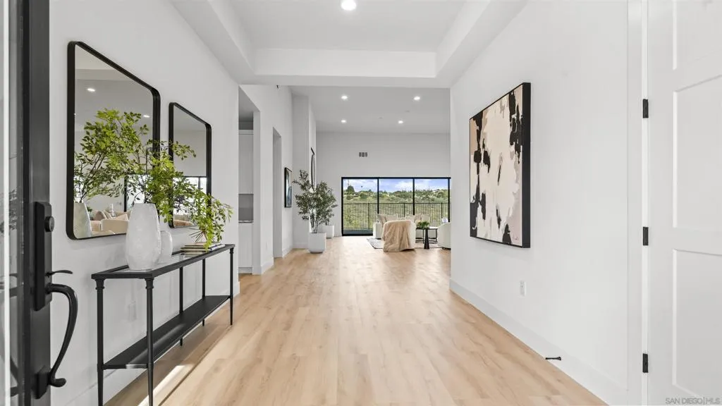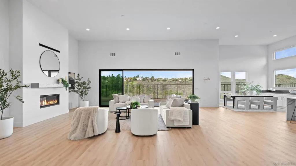 A true stunner, this brand-new, never-lived-in modern home sits on its own private, oversized lot with no neighboring homes, offering exceptional privacy, breathtaking canyon views, and potential to build an ADU. Located in North Poway, near The Heritage and the entrance of Maderas Country Club, the home also provides direct access to nearby hiking trails and serene natural surroundings. This thoughtfully designed residence features 4 bedrooms, 4.5 bathrooms, a dedicated office, and a bonus room, with each bedroom offering its own ensuite bathroom and walk-in closet. Upon entry, you are welcomed into a stunning grand room with soaring 15-foot ceilings and expansive windows that frame the canyon views and flood the home with natural light. The gourmet kitchen is equipped with Thermador appliances, including a 48-inch gas range, hood, wine chiller, microwave, and refrigerator—ideal for both everyday living and entertaining. Recent upgrades include new sleek modern garage doors, new flooring throughout, owned solar, dual-zone HVAC, and an EV charger for modern convenience. As an added value, HOA dues are paid through June 2027. This is a rare opportunity to own a private, luxury new-construction home with views, premium upgrades, and an exceptional location in one of Poway’s most desirable communities.