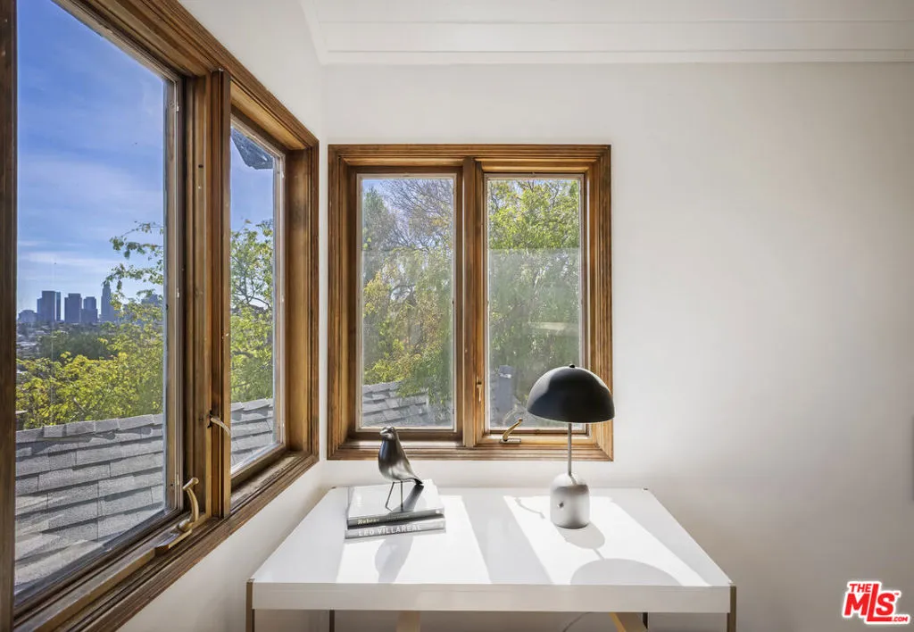 Thoughtfully positioned on a quiet Cul-De-Sac in the Silver Lake Highlands where Effie St. culminates to a stair street sits this exquisite architectural treehouse with 180-degree views. A private oasis in the clouds, gated discreetly for privacy; the front balcony reached from a semi-private driveway reveals a wide-open picture over Elysian Park/Dodger Stadium, spanning beyond Little Tokyo and Downtown LA. Dual front doors of glass open to the bright front room with fireplace. Skylights, a multitude of windows and the glow of glass bricks saturate every bit of space with sunlight and shadows. Spiral staircase leads to the loft with built-in book storage which proves the perfect nook for office or reading. The chic Chef's kitchen features an island with built in beverage/wine cooler and entertainers barstool seating. Designer appliances including Cafe' refrigerator and range and a Bosch dishwasher. Ample cabinets and shelving for appliances give convenience and maximum use of space. On the main level are two generous bedrooms in size, second bedroom with a cedar closet and accent designer wall. From the first level, the private garden with soaring walls of creeping fig, separate entrance, built in Fisher & Paykal grill, gas fire feature and built in seating create the atmosphere for summer time al fresco dining. A stairwell with ascending windows to the primary suite with a private balcony among the trees, oversized luxury closet, primary En suite bath and an airy and bright loft of its own creating a tranquil retreat. The wrap around deck, also overlooking City Hall and DTLA is encompassed by mature pepper trees.Other notables, a tankless water heater, large 2 car garage with integrated shelving for storage and a wide drive for optional parking. Proximity to Sunset Blvd with it's eateries, boutiques and coffee shops. Retreat above the noise and experience Silver Lake and Echo Park with its hidden history feel. Silver Lake continues to be proven one of the most exciting and creative neighborhoods, unmatched in Los Angeles.