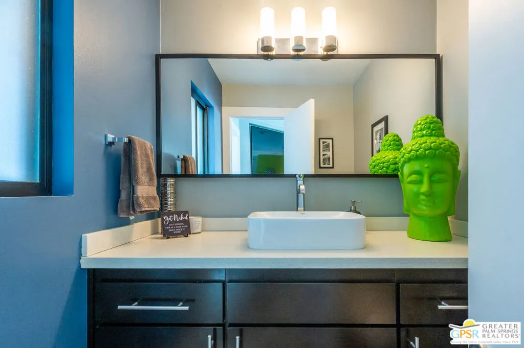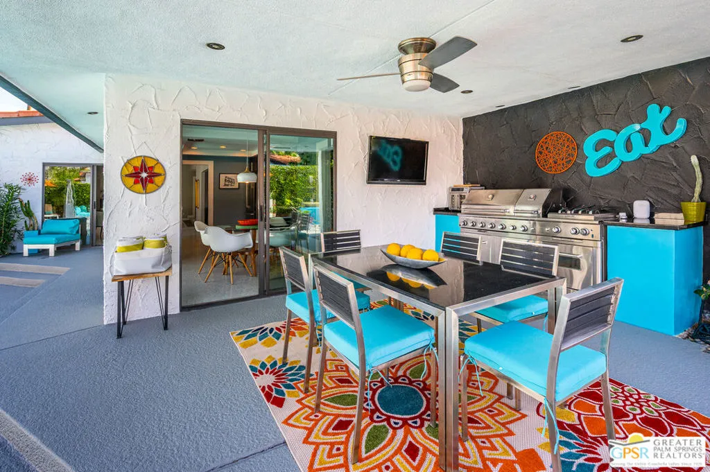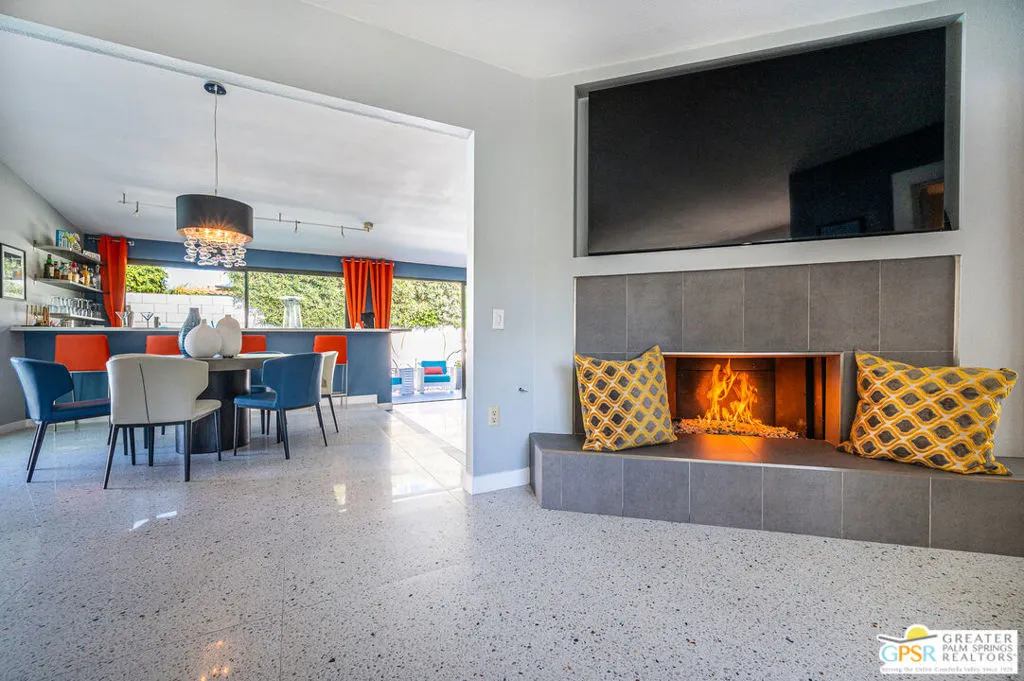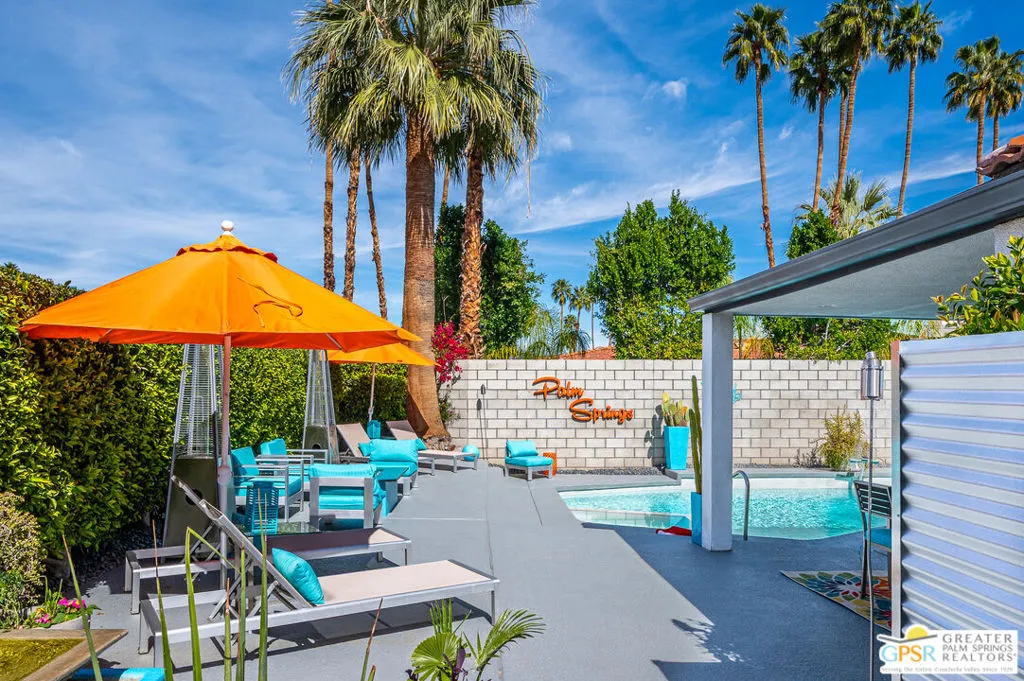 DESERT DREAM OASIS-Welcome home to your Desert Dream Oasis in the quiet, serene Los Compadres neighborhood with buried utilities, sidewalks, and a location just two blocks from the new CV LINK. This absolutely stunning home is a beautiful blend of style and comfort an entertainer's dream. You enter this gorgeous home through a lush courtyard with a fountain and are then greeted by a double glass door into the light and bright entry. Inside, you will find an enormous, open, sunken living room and dining room with vaulted ceilings, exquisite travertine tile floors, and walls of sliding glass doors with stunning mountain views and privacy. The warm and inviting family room, with a tile open-flame gas fireplace and adjacent half bath, is the perfect place to relax and unwind. If you enjoy game nights, there is even a game room that opens to the lush courtyard. Entertainers will love the 12' long full-service bar with a sink, ice maker, and refrigerator/wine cooler that opens to the magnificent pool. If you love cooking, the kitchen will knock your socks off with top-of-the-line Electrolux ICON appliances, gas cooking, two dishwashers, a bright kitchen nook, and a walk-in pantry. Off the kitchen, the entertaining continues with the irresistible covered outdoor poolside living space featuring a heavenly large JennAir grill with an oven, perfect for outdoor cooking year-round. The artistic pool area is a classic Palm Springs Oasis with a stunning pool, hot tub, great outdoor sunbathing, and a bocce ball/cornhole court. Wait no longer; you will be mesmerized by the primary bedroom, which features a vaulted ceiling, a custom walk-in closet, a separate, nicely equipped home gym, and a spa-style bath with a large walk-in tile shower, double vanity, and sunken tub. Also in the bedroom wing of this magnificent home are three additional bedrooms (two with walk-in closets), a beautiful home office with a view, and a large guest bath with a double vanity that opens to a lush, private outdoor shower. No Palm Springs home is complete without a double garage; this home even has custom built-in cabinets and gorgeous glass garage doors, allowing for plenty of natural light. Fee Simple land and 34 solar panels to be paid off at closing! This home truly has it all. Hurry, this one will not last