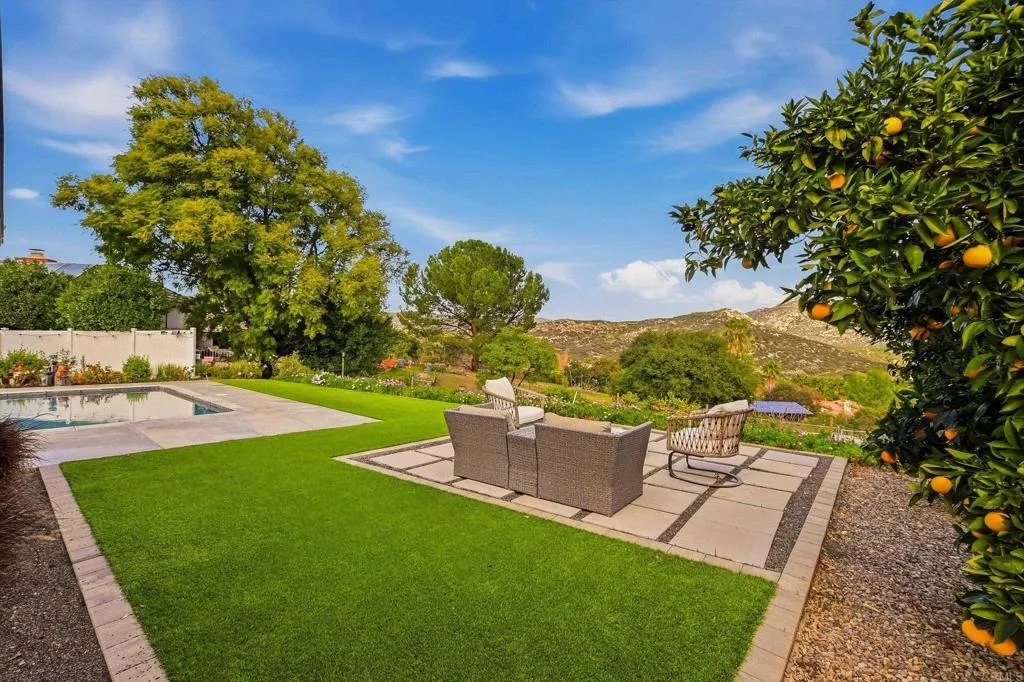 Welcome to your private Spanish-style retreat in the coveted community of San Diego Country Estates—where resort living meets refined design and energy-smart efficiency with paid-off solar. Framed by sweeping mountain and golf course views, this single-story, extensively renovated in 2018, offers seamless indoor-outdoor living with expansive folding doors and dramatic black steel windows that open to a sparkling blue-bottom pool and lush, low-maintenance grounds. A striking double-door entry reveals sunlit interiors, rich wood flooring, and thoughtfully curated spaces. The showpiece island kitchen features custom cabinetry with pull-out pantry drawers, quartz countertops, a built-in wine fridge, and a premium Thermador appliance suite—perfect for both elevated entertaining and everyday living. Designed for comfort and flexibility, the home includes dual-zone HVAC, a whole-house fan, a spacious laundry room with sink and storage, and a convenient pool-access bath. Secondary bedrooms share a Jack-and-Jill bath, while built-ins throughout provide exceptional storage. The detached office is a retreat of its own, complete with heat and A/C, TV, fireplace, and pullout sofa—ideal for work, wellness, or guests. A three-car garage includes an EV charger outlet. Outdoors, a flourishing orchard offers an impressive variety of mature fruit trees—including olive, lemon, apple, peach, orange, cherry, persimmon, tangerine, mango, and avocado—adding beauty, shade, and seasonal harvests to your private oasis. Residents of San Diego Country Estates enjoy access to a clubhouse, pool and spa, BBQ areas, playground, scenic biking and equestrian trails, and RV parking—bringing everyday luxury to life in a truly resort-inspired setting.