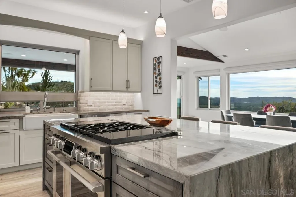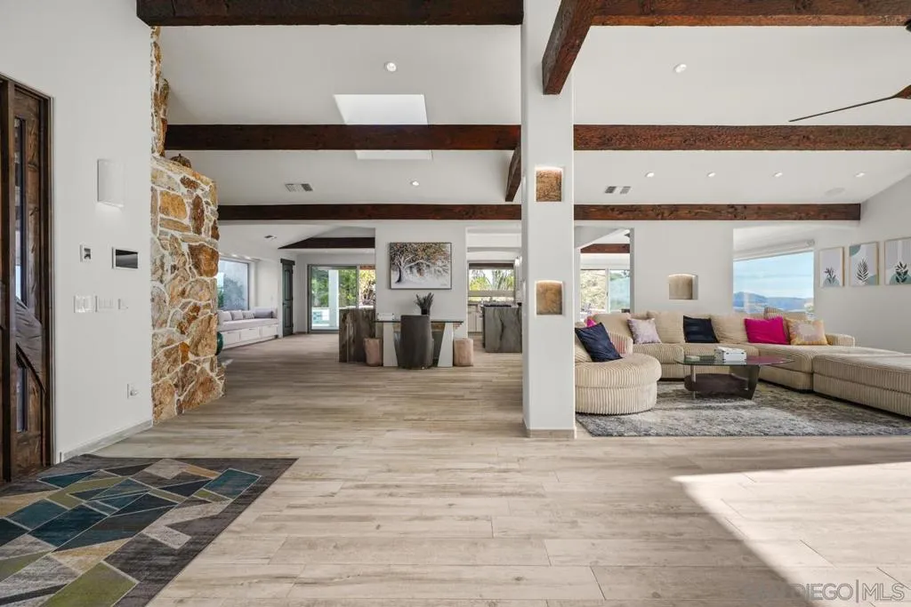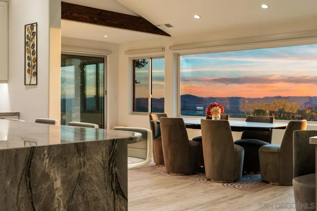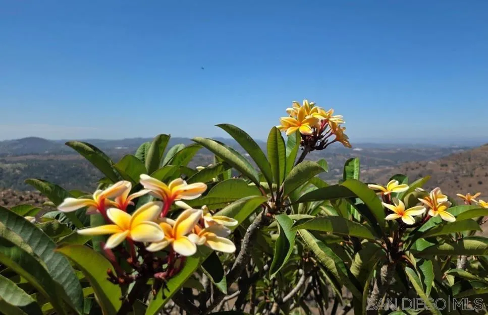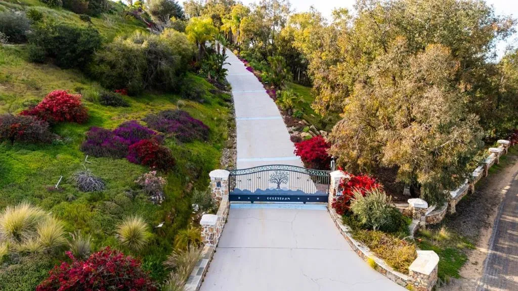 Live above it all and embrace the pinnacle of the Southern California lifestyle. Set atop 6 private acres in the prestigious hills of Valley Center, this remastered Modern Mediterranean estate captures unobstructed panoramic views stretching from mountain ranges to the Pacific—offering breathtaking sunrises and unforgettable ocean-view sunsets year-round. Designed for refined indoor-outdoor living, the single-level residence offers over 3,000 square feet of curated luxury with 2 spacious bedroom suites and 2 baths. A gated entry and winding private drive lead to a dramatic arrival, where guests are welcomed beneath a porte cochere and into a grand interior defined by soaring beamed ceilings, a statement rock fireplace, and walls of Fleetwood glass doors framing endless vistas. The smart home is appointed with quartz surfaces, Signature Kitchen Suite appliances, a center island, wine refrigeration, and a wet bar—ideal for elevated entertaining. Radiant heated floors, including the primary shower, add spa-level comfort. The primary suite features its own fireplace, walk-in closet, and sweeping valley to ocean views, while the secondary suite enjoys serene eastern mountain panoramas. Outdoor amenities rival a private resort: pool, spa, expansive view deck with BBQ, walking paths through olive and fruit trees, and professionally integrated lighting throughout the grounds. Solar, EV charging, brand-new HVAC, advanced security, electronic shades, and remote-access systems provide seamless modern convenience. The grounds themselves are a botanical sanctuary—an artfully cultivated garden of vibrant blooms and sculptural plantings. Mature protea, fragrant plumeria, and striking grevillea create year-round color, texture, and fragrance, attracting hummingbirds and enhancing the estate’s serene, resort-like ambiance. Located less than an hour from San Diego’s world-class beaches, this extraordinary estate also offers potential for private events or luxury short-term rental. With globally sourced architectural details—from a handcrafted Mexican front door, Japanese glazed roof tiles, porcelain floor tiles from Eastern Europe, to illuminated Brazilian fossilized tile accents—this is a rare opportunity to own a truly one-of-a-kind Southern California sanctuary.