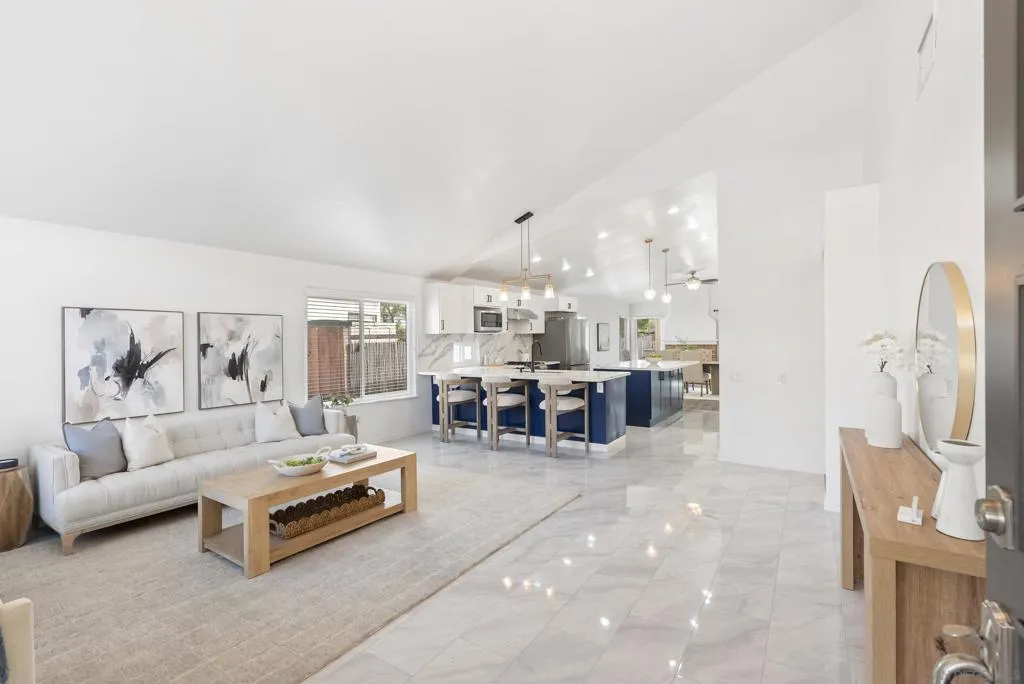 Highly desirable and rarely available single-story home in the heart of Park Village. This 4-bedroom, 2-bath residence offers nearly 2,000 square feet of beautifully updated living space. The recently updated kitchen, along with remodeled living and dining areas, creates a fresh and inviting feel from the moment you walk in. The main living spaces feature durable tile flooring, vaulted ceilings, and abundant natural light that gives the home an open, airy atmosphere. The kitchen showcases quartz countertops, stainless steel appliances, newer cabinetry, and a functional breakfast bar with space for a dining table. It flows seamlessly into the family room, anchored by a cozy fireplace — a comfortable space to relax or gather with friends and family. Both bathrooms have been tastefully updated. Bedroom four is generously sized and offers flexibility as a guest room, home office, or bonus space, with plenty of room to add a closet if desired. Step outside to a beautifully covered patio, perfect for extending your outdoor living space and enjoying peaceful sunset evenings. The refreshed front yard features beautiful landscaping and low-maintenance artificial turf, adding curb appeal while keeping upkeep simple. Conveniently located near major highways for easy commuting. Leased solar helps reduce monthly electric bills.