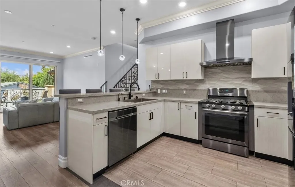 Interior highlights include wood flooring | recessed lighting | contemporary finishes | bright living room with natural light. The living area flows seamlessly into the dining space and modern kitchen, featuring ample cabinetry, generous counter space, and updated appliances, ideal for both everyday living and entertaining.