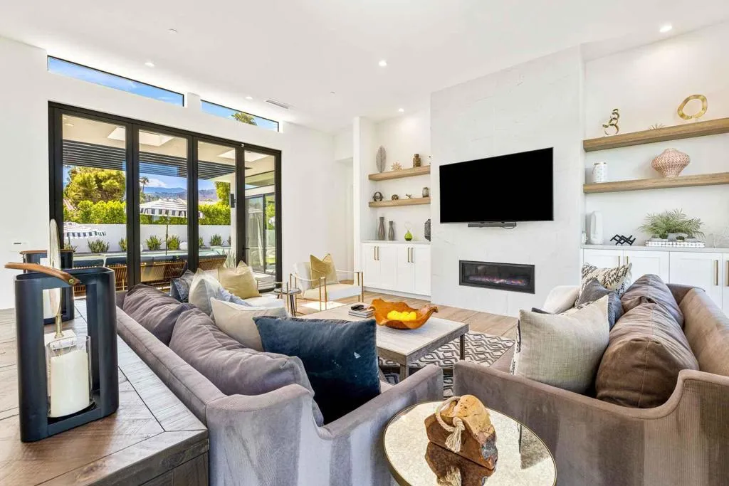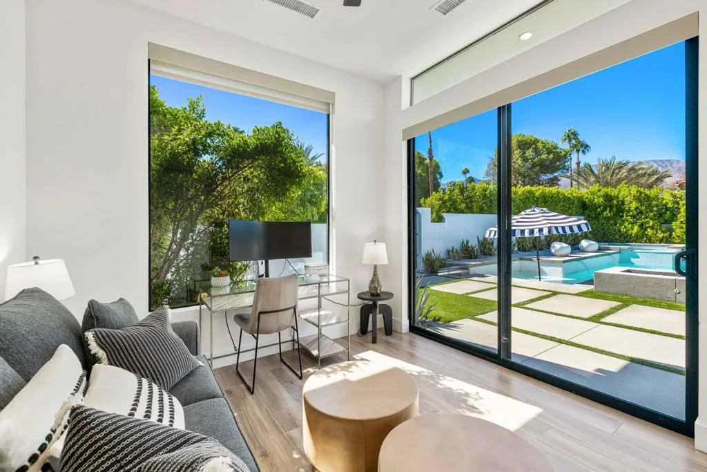 New co-ownership opportunity: Own one-eighth of this turnkey home, professionally managed by Pacaso. The all-white exterior emphasizes the clean, modern design, complemented by faux turf lawns, a pool with aqua tones, and contemporary black-trimmed windows with concrete slab walkways. Privacy walls and a gated entrance enhance comfort around the pool area, which features multiple water elements and a multi-colored light system. A poolside fire pit offers views of the surrounding mountains. Sliding doors from both the front and rear yards open to a spacious interior with an open-concept living and dining area centered around a sleek fireplace wall. White walls and plank tile flooring extend throughout the home, contributing to its modern aesthetic. The kitchen includes soft-close cabinetry, quartz countertops with a waterfall-edge island, a marble tile backsplash, a dining nook, and a coffee station. The space overlooks the pool and back patio, which includes a built-in barbecue island. The primary suite is located in its own wing, with glass doors to the pool area and clerestory windows for natural light. The ensuite features a soaking tub and double rain showers behind a dual splash panel. Two guest rooms share a Jack-and-Jill bath, another bedroom has a private ensuite, and a detached casita provides a fifth bedroom and ensuite. The home comes fully furnished and professionally decorated.