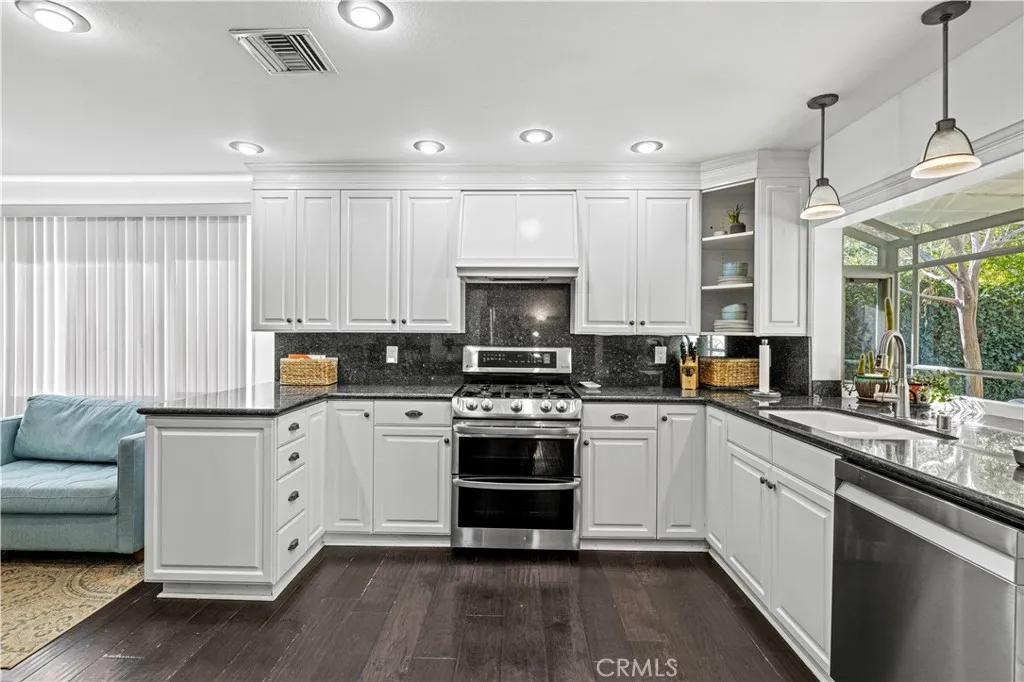Inside, you’ll find wood flooring and an open layout that creates a comfortable flow between the kitchen and family room. Dual-pane windows and a whole-house fan enhance energy efficiency and everyday comfort. The kitchen offers white cabinetry, granite countertops, stainless steel appliances, recessed lighting, and added built-ins in the office area for extra storage and functionality. It opens directly to the living spaces, making it practical for daily living and gatherings alike.