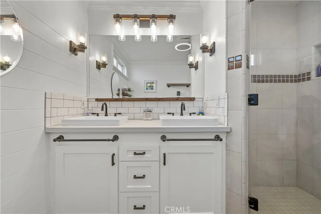 The primary suite includes custom built-ins in the closet and a remodeled ensuite bathroom with a large shower, quartz countertops, and subway tile backsplash. Three additional well-sized bedrooms share a remodeled hall bathroom.