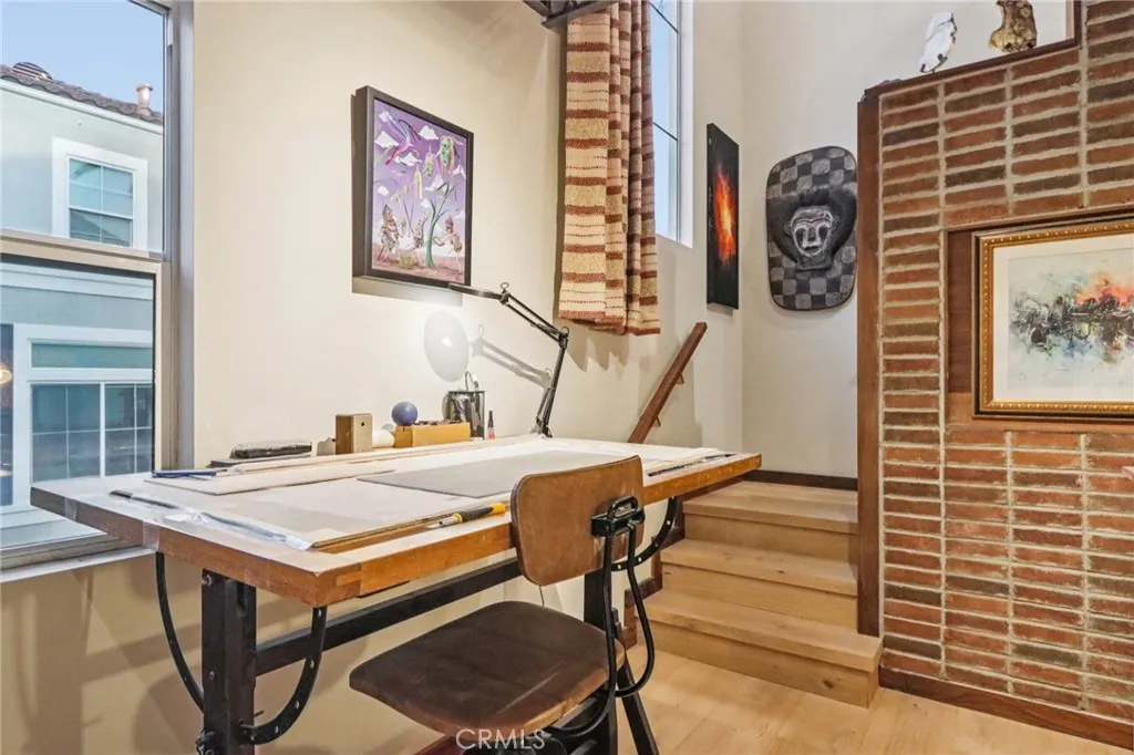 The loft showcases an industrial-artistic ceiling with exposed rebar and rope, while the second-floor staircase is enhanced by a soffitted ceiling, vintage lighting, and charming brick veneer walls—creating a warm and dramatic architectural focal point. Additional upgrades include remodeled bathrooms, a new primary shower with porcelain and Trex wood finishes, a newer A/C unit, all-new doors with opaque glass, and a custom-designed garage featuring a tin roof, African mahogany storage cabinetry, and track lighting.