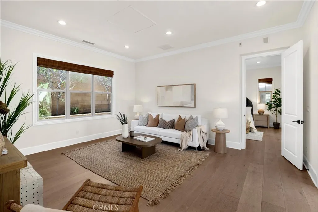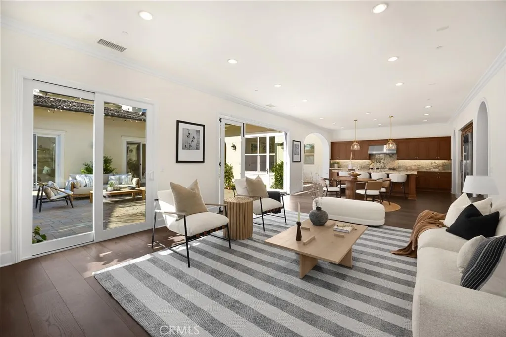 TWO HOMES on ONE lot! The fully detached SINGLE LEVEL guest house with TWO en-suite bedrooms connected by a central family room, offers exceptional privacy and versatility. No Mello Roos Tax! Exclusive 24h guard gated community. 77 Clifford is a luxurious award winning estate The Grove Plan 2. Designed with intentional spaces for grandparents, parents, and children alike. Private retreats and generous gathering areas create harmony for every generation where family legacy and modern comfort coexist beautifully. Embracing a Japandi aesthetic of organic natural materials earthy wood and stone, the design balances simplicity, minimalism, and functionality; creating a calming, harmonious feel. Natural light flows through numerous windows, creating a bright, airy atmosphere throughout. The high-ceiling stairway leads to a versatile loft space. The bedrooms are all en-suite, are uniquely spacious, and designed with privacy in mind. The luxurious primary suite features an enlarged dream walk-in closet with checkered flooring, that attaches directly to the private office. A freshly renovated spa-inspired bathroom, dual vanities, and an additional walk-in closet completes the space. The great room flows seamlessly into a host's dream kitchen, outfitted with PRO Sub-Zero and Wolf built-in appliances. The versatile butler’s pantry is perfect as a coffee station, secondary prep area, or discreet serving space when entertaining. This extension of the kitchen enhances both functionality and flow for elevated everyday living. The main home and guest house are lined with vast windows and towering bi-fold glass doors that open to a spacious courtyard complete with twinkling string lights. The courtyard offers a serene setting perfect for quiet mornings or al fresco dinners.