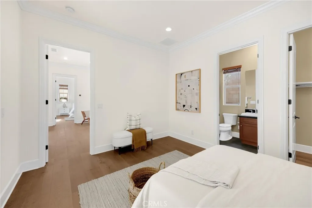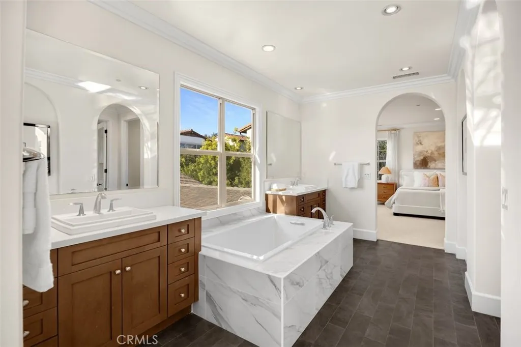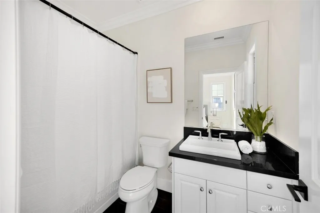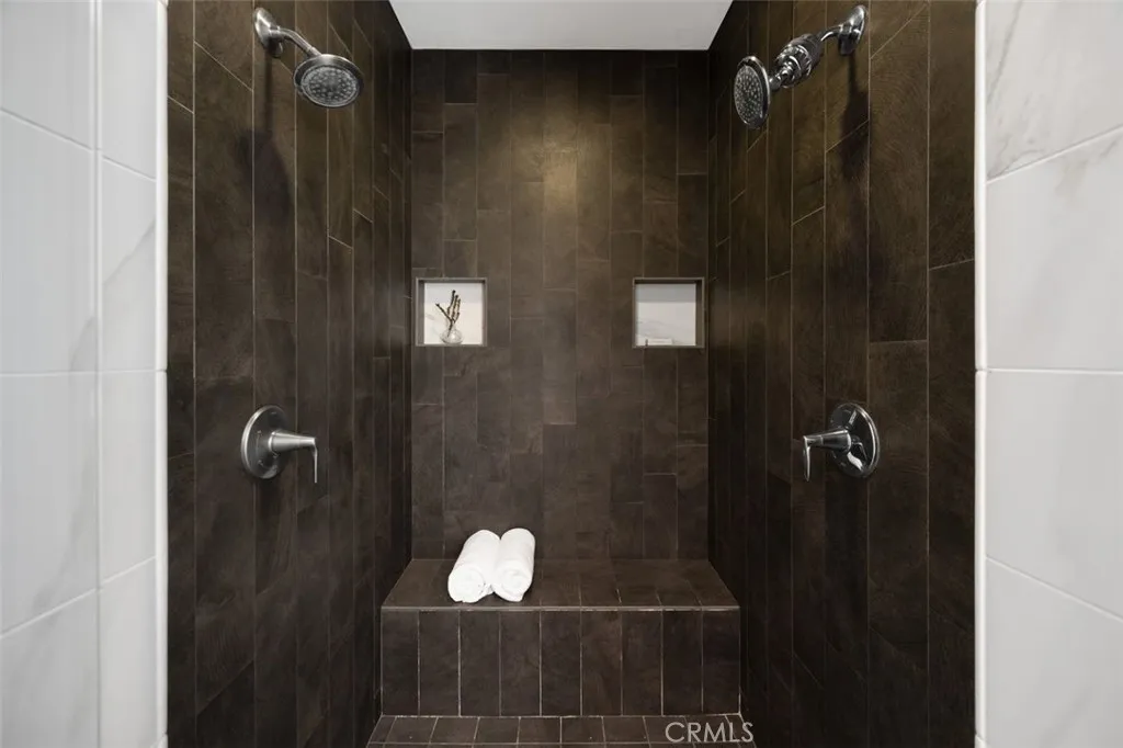 The high-ceiling stairway leads to a versatile loft space. The bedrooms are all en-suite, are uniquely spacious, and designed with privacy in mind. The luxurious primary suite features an enlarged dream walk-in closet with checkered flooring, that attaches directly to the private office. A freshly renovated spa-inspired bathroom, dual vanities, and an additional walk-in closet completes the space.