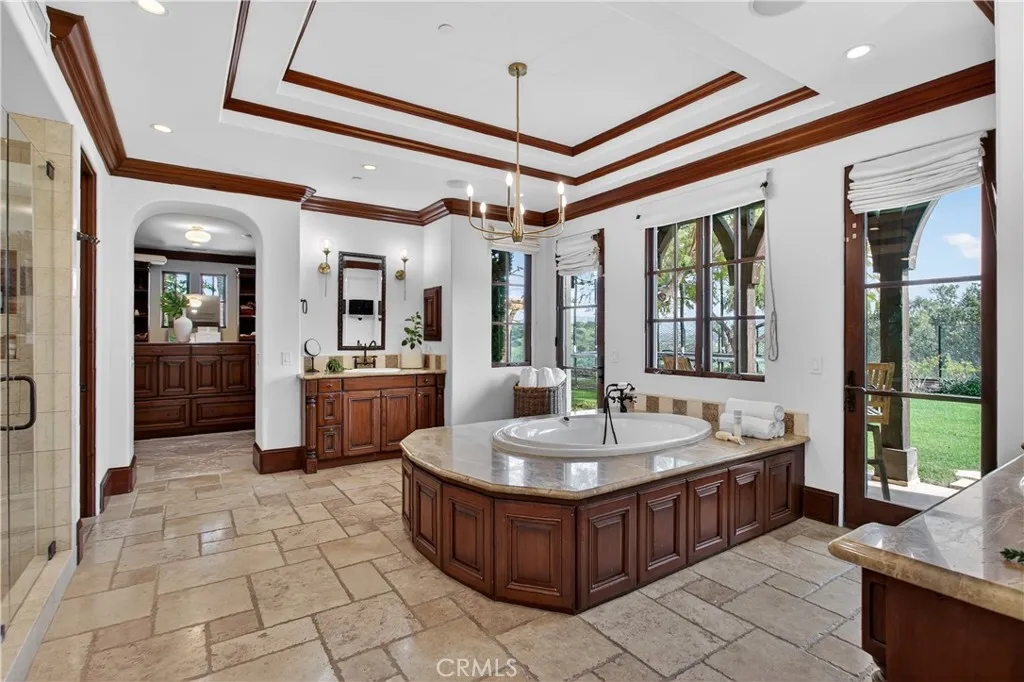 The main-floor primary suite is a private oasis with its own upstairs retreat—ideal for a nursery, gym, or office—plus a spacious walk-in closet with island. The spa-like bath features a jetted tub, separate shower, dual toilets, and a dedicated vanity.