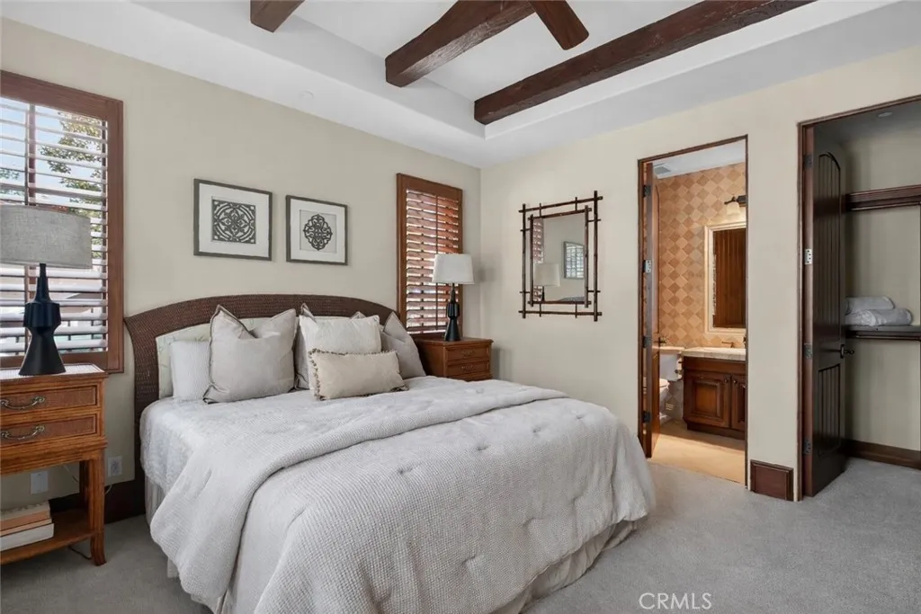 A gated entry leads to a serene courtyard where natural landscaping and a fountain set a tranquil tone. Inside, French oak floors, soaring cathedral ceilings, adorned with beautifully crafted beams and walls of French doors bathe the home in uplifting natural light, creating an inviting flow that blurs the line between indoors and out.