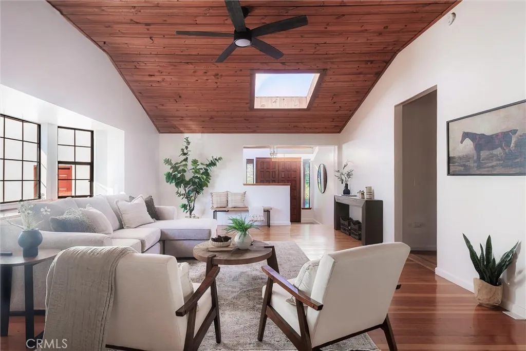 The versatile floor plan features formal living and family rooms anchored by soaring vaulted wood ceilings and custom oversized windows. Abundant natural light pours through multiple skylights, beautifully illuminating the rich character of the Old World Fir wood flooring throughout. The updated kitchen is a chef’s delight, featuring a brand-new cooktop and a dedicated wine refrigerator. With three spacious bedrooms, two bathrooms, and a private office retreat, the home offers a seamless balance of work and relaxation.