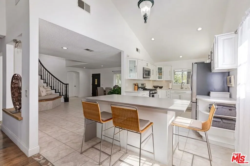 Located on a picturesque, tree-lined street in the sought-after Los Cerritos neighborhood, this thoughtfully updated and meticulously maintained two-story residence blends timeless architecture with refined indoor-outdoor living just moments from Virginia Country Club and the shops and dining of Bixby Knolls. A striking front walkway framed by mature, stately palm trees creates a grand, colonnade-like approach, setting the tone before you step inside. High vaulted ceilings and expansive windows fill the dramatic living room with natural light, anchored by a fireplace and French doors that open seamlessly to the backyard. The remodeled kitchen features white cabinetry, quartz countertops, stainless appliances, and a center island, flowing effortlessly into formal and casual dining spaces designed for everyday living and entertaining. Upstairs, the spacious primary suite is complemented by a renovated bath with dual vanity and glass-enclosed shower, while additional bedrooms offer flexible space for family, guests, or a dedicated home office. The private backyard includes a covered deck and brick patio ideal for al fresco dining, weekend gatherings, and relaxed evenings outdoors, along with a detached two-car garage and generous lawn. Set within one of Long Beach's most established enclaves known for wide streets, architectural character, parks, golf, and top-rated schools, this home offers classic Los Cerritos living with elegance and modern comfort.