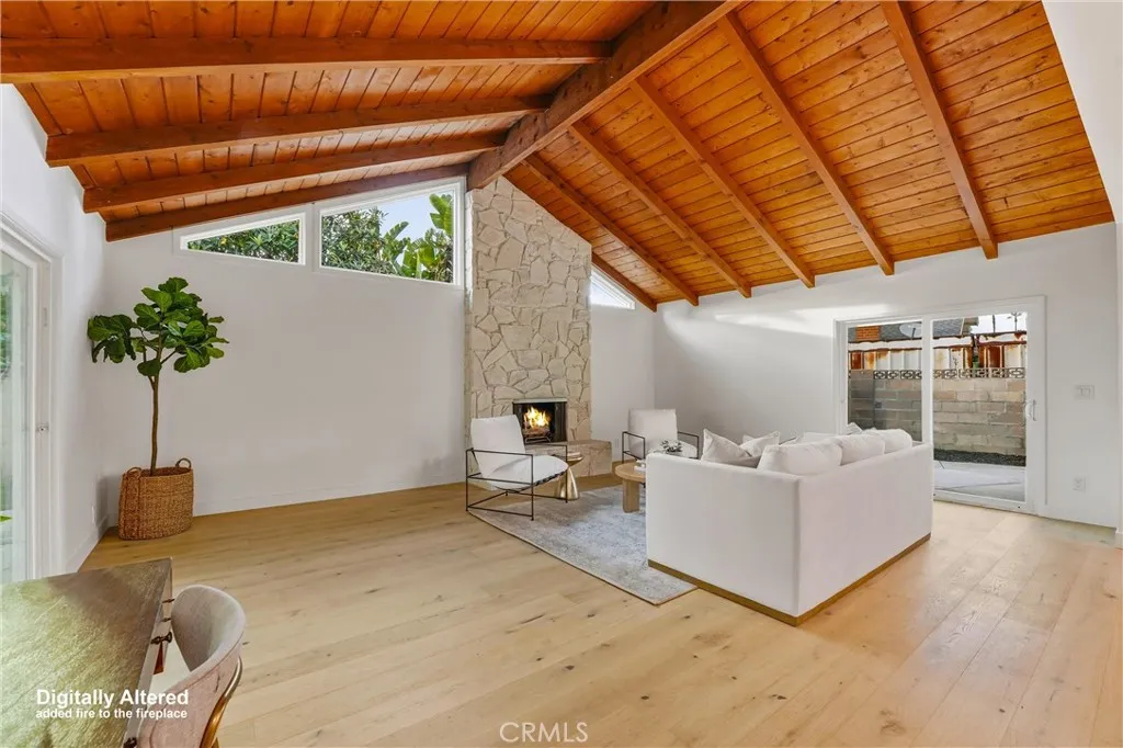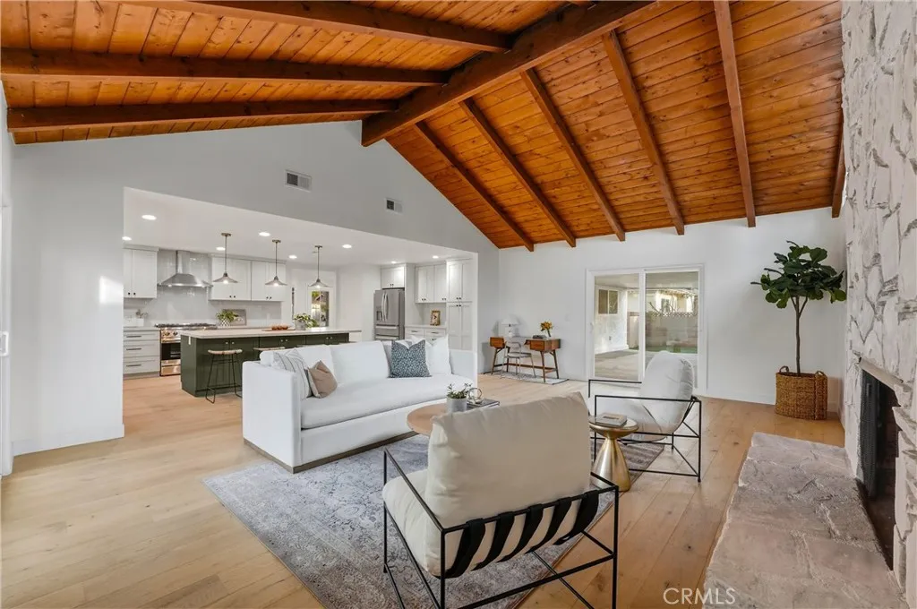 Completely re-imagined, an exceptional turnkey residence on a beautiful quiet tree lined street in one of Orange’s most sought after neighborhoods. From the moment you enter wide-plank engineered hardwood floors create an immediate sense of warmth and sophistication guiding you through a home thoughtfully designed for elevated entertaining and effortless daily living.The living room makes a striking impression, anchored by a dramatic stone fireplace and framed by the dark-stained tongue-and-groove wood plank ceiling—an architectural feature that blends timeless character with modern elegance. The open-concept layout flows seamlessly into a chef-caliber kitchen that rivals custom luxury builds. Professional grade appliances including a 36” six-burner gas range, built-in microwave drawer, integrated dishwasher and refrigerator—are paired with a commanding oversized island designed for gathering. Custom cabinetry in designer-selected hues complements stunning Taj Mahal quartz countertops, creating a space that feels straight out of a high-end design magazine. Statement lighting from Visual Comfort, Studio McGee, and exclusive Pure Salt Interiors selections add a layer of curated sophistication rarely found in this price range. The guest bath showcases Bedrosians porcelain tile, while the spa-inspired primary suite is wrapped in floor-to-ceiling marble. A Rejuvenation oak vanity crowned with marble and accented by Kingston Brass fixtures completes the retreat with effortless, designer-level refinement. Beyond aesthetics, the home offers enduring quality and meaningful upgrades: dual-pane windows and sliding doors, a newly installed roof with a 50-year material warranty and 25-year labor warranty, a newer HVAC system, and a recently replaced water heater. The epoxy-finished two-car garage delivers a sleek, gallery-like presentation and includes a dedicated laundry space with washer and dryer. With convenient access to the 91 and 55 freeways and proximity to highly regarded schools, the location offers both prestige and practicality. Homes with this caliber of finishes, architectural charm, and thoughtful renovation are typically reserved for significantly higher price points—making this a rare opportunity to own a truly designer-curated residence without the designer-level premium.This is more than a home. It's elevated living,exceptional craftsmanship,and luxury redefined offered at a value that is nearly impossible to replicate.