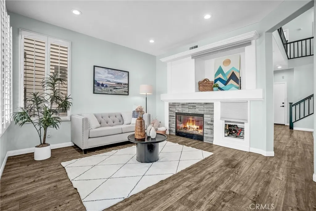 FABULOUS LAYOUT AND SUPERB SETTING! Absolutely spectacular property located in the Lyon Gallery enclave within the prestigious Hillsborough Collection gated community of La Mirada. An incredible opportunity to live in this exclusive neighborhood! Featuring three bedrooms and 2.5 bathrooms, this home is perfectly situated in a quiet location and thoughtfully designed for today’s lifestyle with seamless flow throughout. From the moment you arrive, the fantastic curb appeal reflects true pride of ownership. Move-in ready with opportunity to add your personal touches. A grand entry with dramatic cathedral ceilings welcomes you into an open-concept floor plan filled with an abundance of natural light. The inviting living room opens to the formal dining room, creating a wonderful space for entertaining family and friends. A convenient downstairs half bathroom adds functionality. Beautiful waterproof laminate flooring runs throughout the home. The comfortable family room features a fireplace, media niche, and custom cabinetry — perfect for gathering and relaxing. The well-appointed kitchen is upgraded white cabinetry, granite countertops, a beautiful tile backsplash, and stainless steel appliances. The spacious and inviting primary suite offers a resort-style bathroom with dual sinks, a soaking tub, separate shower, and walk-in closet. Plantation shutters, recessed lighting, and upgraded light fixtures enhance the home’s appeal. A handy upstairs laundry room adds everyday convenience. Step outside to a generously sized backyard ideal for outdoor entertaining. Ideally located near the Los Coyotes Country Club and the beautiful Clark Regional Park, this home also offers exceptional convenience with close proximity to everything you need. A rare opportunity in a highly desirable gated community — don’t miss it!
