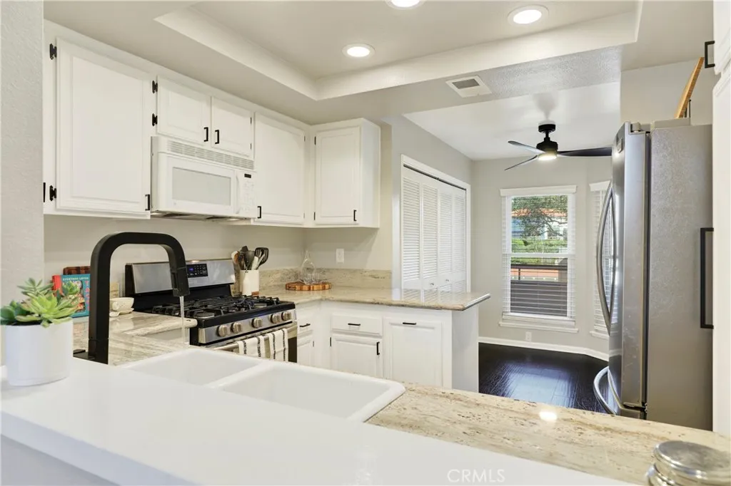 Welcome to this spacious 3-bedroom, 2-bath upper-level condo located in the heart of Mission Viejo, just steps from the Mission Viejo Country Club Golf Course. Enjoy a light and bright open layout with soaring high ceilings, recessed lighting, new window blinds, and upgraded double-pane windows from Renewal by Andersen throughout. The home features wood based laminate floors spanning the main living areas and bedrooms, with cozy carpet on the stairs and in the spacious loft, perfect for a home office, bonus room, or additional living space. The kitchen includes light granite countertops, ample storage, and a seamless flow into the dining and living areas. Retreat to the beautifully remodeled primary bathroom, offering modern finishes and a spa like feel with a walk-in closet by California Closets. Two additional bedrooms provide comfort and flexibility for family, guests, or work-from-home needs. Relax on your private balcony accessible from the primary bedroom and living areas with a peek-a-boo view of the golf course. Enjoy peaceful surroundings and the convenience of being near community amenities, shopping, dining, and access to Lake Mission Viejo for boating, beaches, and year-round recreation. This upgraded condo blends comfort, style, and location - an exceptional opportunity in a sought-after neighborhood. You don't want to miss it!