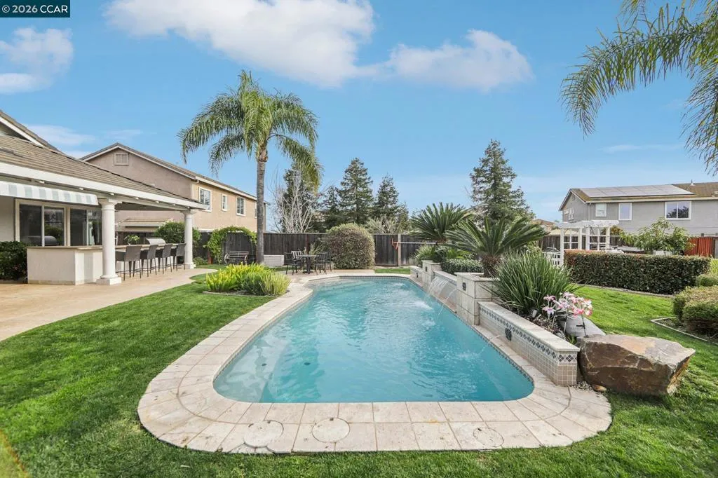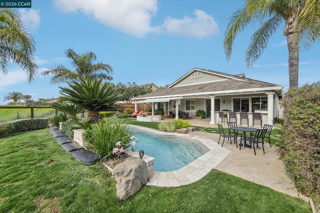 Welcome home to this exceptional property offering privacy, space, and unforgettable views. Backing to open space with no rear neighbors, the backyard is a true retreat where you can take in breathtaking views of Mount Diablo right from your own oasis. Designed for both relaxation and entertaining, the outdoor space features a sparkling pool, a sunken hot tub, and a built-in gas fire pit that creates the perfect ambiance for evening gatherings. The outdoor kitchen makes hosting effortless, while the expansive wood overhang and retractable awning provide comfortable shaded areas year-round. Fruit trees and a charming chicken coop add character and functionality to this incredible backyard setting. The home offers a spacious and inviting open layout with a beautifully updated kitchen that flows seamlessly into the main living areas. The large primary suite is conveniently located downstairs, offering comfort and privacy, along with a versatile den that can serve as a home office, playroom, or additional flex space to fit your needs. Additional highlights, side yard access and a three-car garage, providing ample room for vehicles, storage, or recreational toys. With stunning views, exceptional outdoor living, and a thoughtfully designed interior, this home truly has it all!