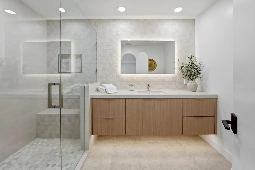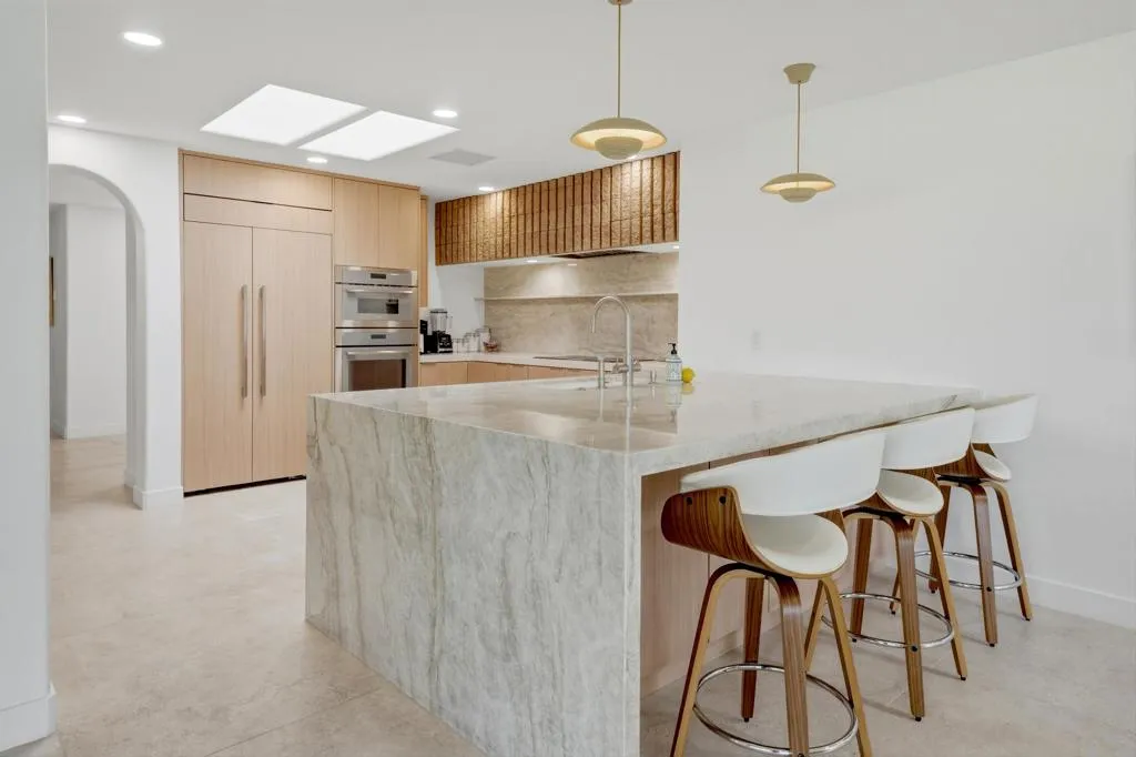 Thoughtfully redesigned and meticulously remodeled, this private, desert retreat is one of the most extensively reimagined homes in The Springs Country Club, created for buyers seeking zero projects, modern finishes, and effortless desert living. Beyond cosmetic updates, the home has been fully re-envisioned with level-5 smooth walls, imported flooring, and textured designer tile, delivering a refined, spa-like indoor-outdoor lifestyle.The chef's kitchen anchors the home with an oversized Taj Mahal stone waterfall island, full-slab backsplash, and a premium suite of Thermador and JennAir appliances. Designed for entertaining, it flows seamlessly into the dining area with custom cabinetry and a floating sideboard, while a concealed floor-to-ceiling bookcase reveals a walk-in pantry.All three bedrooms feature walk-in closets with built-ins and ensuite baths finished in cohesive imported tile. Additional upgrades include motorized shades, upgraded plumbing and electrical, a whole-home LifeSource water filtration system, and a mini-split AC in the garage.Enjoy a wraparound terrace with mountain views, morning light, and sunset skies. With a larger footprint than most comparables, a prime interior location, and easy walkability to clubhouse amenities, this move-in-ready home stands apart. Residents enjoy golf, tennis, pickleball, fitness center, spa services, and a vibrant social community.