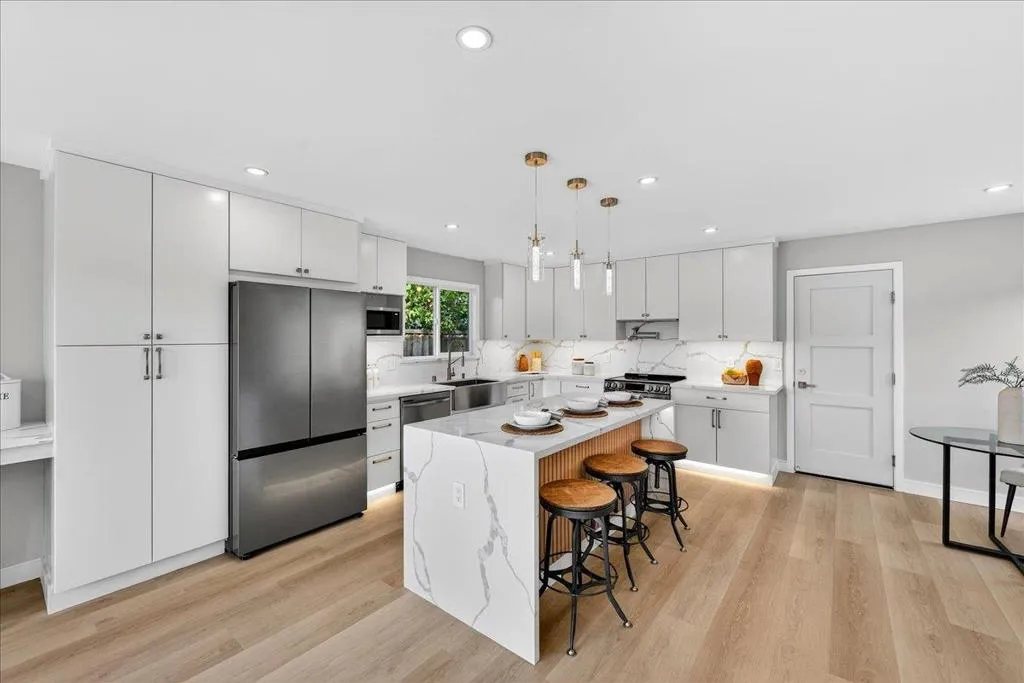 Welcome to this fully remodeled charming 4-bedroom, 2-bathroom home in the vibrant city of San Jose. Spanning 1,640 square feet, this residence offers a modern open-concept layout. The heart of the home is the beautifully appointed kitchen, featuring sleek quartz countertops, a spacious island, and stainless steel appliances including a dishwasher, microwave, oven range, and refrigerator. The kitchen seamlessly flows into the family room, creating a perfect space for gatherings and family meals. The home boasts durable laminate flooring throughout, providing both style and ease of maintenance. A cozy fireplace adds warmth and ambiance to the living space, ideal for relaxing evenings. The property is equipped with central air conditioning and heating to ensure year-round comfort. Additional amenities include a convenient laundry area and a two-car garage. This home is situated within the San Jose Unified School District. Experience the best of San Jose living in this well-appointed home, offering both comfort and functionality.
