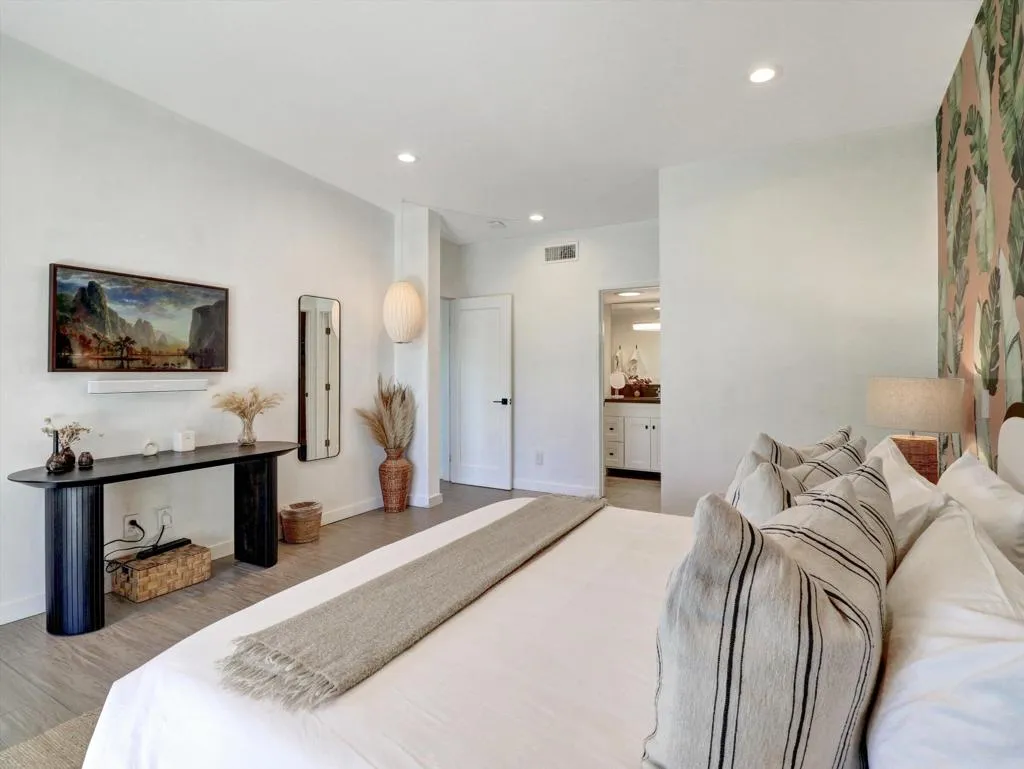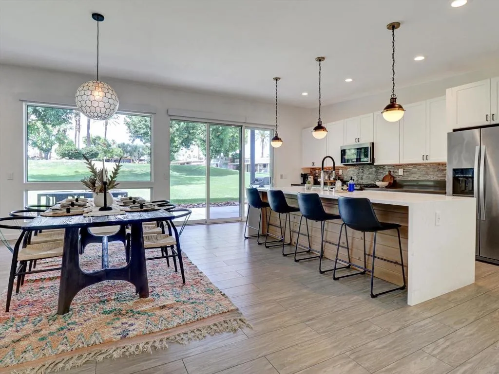 A rare offering in the coveted Indian Wells Village community, where modern luxury meets effortless desert living. This home was renovated down to the studs in 2018 creating vaulted ceilings and modernizing the construction. The 3 bedroom, 2 bath residence is offered fully furnished and has a proven track record as a successful vacation rental/second home, presenting an exceptional turnkey opportunity for both investors and those seeking a refined personal retreat.Perfectly positioned just moments from the world-famous Indian Wells Tennis Garden, this home places you at the center of premier events, dining, and recreation while maintaining a sense of privacy within an intimate enclave of only nineteen residences.Inside, walls of glass and stacking sliding doors seamlessly blend indoor and outdoor living, enhanced by automated blinds and thoughtfully curated designer finishes throughout. The open concept floor plan is both sophisticated and functional, featuring Smart Home Automation, a fully owned 19-panel solar system with Tesla Power wall, Hansgrohe kitchen and bath fixtures, designer wallpaper, and Jonathan Adler automated drapery in both the primary and guest bedrooms.Step outside to your private oasis, where a beautifully designed pool and tongue-and-groove wood patio cover create the perfect setting for relaxation or entertaining under the desert sky.Indian Wells Village stands apart as one of the few HOA communities in Indian Wells that allows short-term rentals with city restrictions, making this property especially valuable. With an OWNED SOLAR system and the low $400/month HOA fee that includes front- rear landscaping and pool maintenance allows for truly effortless ownership.This is more than a home. It is a lifestyle investment in one of the desert's most sought-after locations.