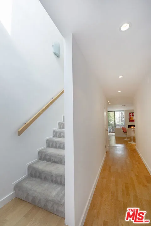 Charming two-level townhouse located at Sunset Strip: West Hollywood and on the border of Beverly Hills. Award-winning Architecturally designed by acclaimed Architect Ron Goldman, FAIA. Designed Carolwood Condominiums. The building is celebrated for its modern design, floor-to-ceiling windows, light-filled spaces and a blend of indoor-outdoor living with lush landscaping, a gated community, resort-style amenities including a heated pool, spa, fitness center. Secured gated garage with 2 side by side parking spaces. The townhouse features a dramatic step-down living room anchored by fireplace, high ceilings and hardwood floor, direct access to a private patio, East front facing with Sun filled morning natural sun light, a thoughtfully organized kitchen, a guest powder room. Upstairs offer 2 spacious bedrooms & 2 bathrooms, giving it more of a house-like feel within a boutique community. Great Location: steps out to Sunset Strip/West Hollywood and mins to Beverly Hills, yet it is quiet home in urban city life style.
