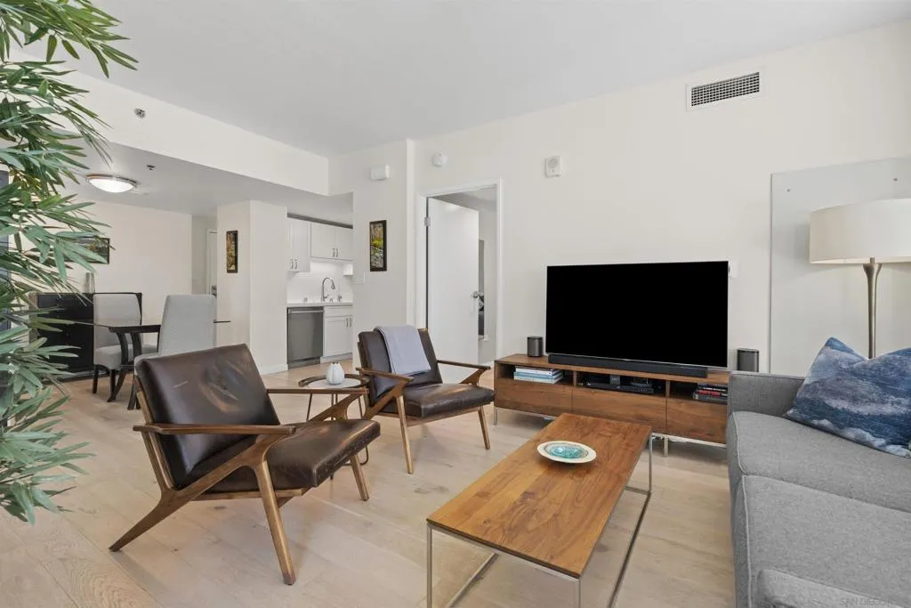 Little Italy Stunner! This immaculate 2-bedroom, 2 bath CORNER UNIT on the 12th floor of Acqua Vista is bathed in natural light and shows like a model home! Located in the vibrant heart of Little Italy - Downtown San Diego’s most sought-after neighborhood, and just moments away from countless restaurants, nightlife hotspots, chic cafes and the beloved Saturday Farmer’s Market make this the perfect residence for your new urban lifestyle. Split-bedroom open floor plan with a spacious living and dining area, featuring sleek Reward Barbados European oak engineered hardwood flooring. The remodeled kitchen boasts white cabinetry, Silestone quartz countertops, a stainless undermount sink with Culligan osmosis reverse system, and Bosch & Whirlpool stainless appliances. Enjoy a covered balcony with city views—without the hot afternoon sun. Additional upgrades include custom shutters and wood blinds, newer washer/dryer, and added storage. Valet parking is included for one vehicle, and a second spot may be leased. Building amenities include 24-hour lobby attendants, an 8th-floor pool and hot tub, and a fully equipped exercise room. Downtown San Diego's Little Italy is a vibrant culinary and cultural hotspot, beloved for its rich history and modern flairs. Classic restaurants like Mona Lisa and Civico 1845, alongside new favorites Ironside, Juniper & Ivy, and Craft & Commerce, make it a go-to for local foodies. The neighborhood is filled with cafes, bakeries, boutiques, bars, and wine shops, perfect for an evening wander. The Little Italy Association also keeps the calendar full with community events such as art walks, car shows, the yearly Little Italy Festa, and a vibrant Farmers Market on Wednesdays and Saturdays. Don’t forget the NoLi Art & Design District, a vibrant hub that includes a collection of retail outlets, designer boutiques, and art galleries, all boasting unique home items and rare discoveries to help you curate the perfect ambiance for your new residence. Acqua Vista features complimentary valet parking for residents, 24/7 security and lobby attendants, a fitness center, and an 8th floor pool and spa deck, barbecues and lounge area. Residents can also take advantage of the community’s electric vehicle charging stations. *Have a 2nd vehicle? The HOA leases additional parking spaces too!*