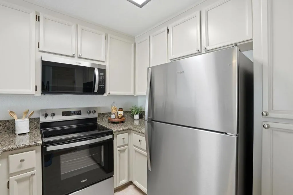 Lakeview Terrace offers ponds, fountains, and winding pathways that create a rare retreat just minutes from city life. This is one of the few units with a direct, unobstructed pond view - overlooking open water instead of carports, streets, or neighboring buildings. From your second-story private balcony, watch ducks glide across the pond, listen to the fountains, or unwind under the evening sky. Location is what sets this 2-bedroom, 1-bath home apart within the community. Inside features include new HOA-approved luxury vinyl plank flooring, all-new kitchen appliances, indoor laundry with washer and dryer included, central air conditioning, and a storage closet off the balcony. One assigned parking space and ample guest parking are included. A rare opportunity to own one of the communitys most desirable pond-view locations.